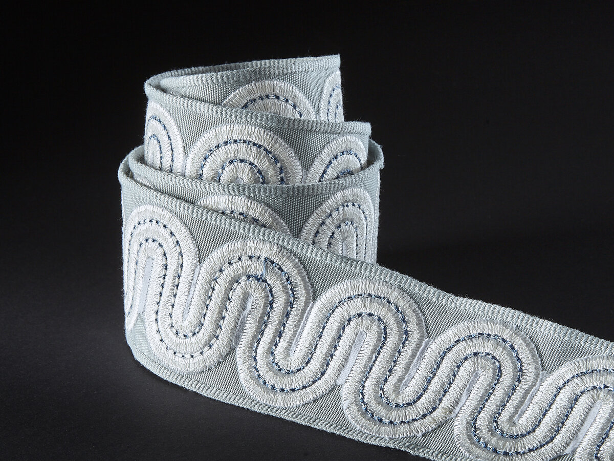 The graphic movement found in the deep wave of this tape was inspired by the iconic LOMBARD STREET in San Francisco. Embroidered on a woven tape custom made for this design, Lombard Street is a embroidery with two colours of viscose.