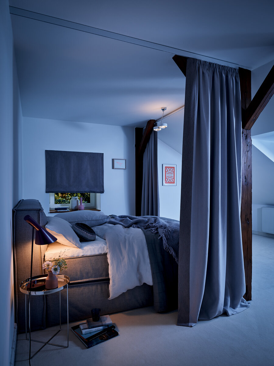 LUMIERE DIMOUT is twice as beautiful. Because the faux-uni is printed on both sides, sometimes harmoniously in similar colours, sometimes rich in contrast. Both colour schemes invite for creative decoration. What a “pity” that you cannot always enjoy them – because LUMIERE DIMOUT also ensures your carefree sleep through perfect darkening. Still you can simply dream about the finely printed texture, the pleasant feel and the soft fall of the permanently flame-resistant yarn.