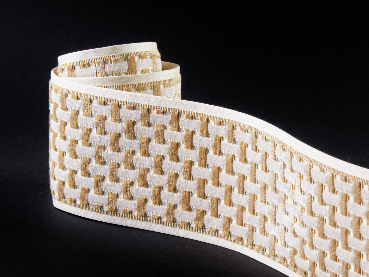 Inspired by beautiful cane baskets, LYNDEN VELVET TAPE is a dimensional cut velvet woven on traditional wire looms. The interlacing cut pile pattern is enhanced by fine epingle lines at the edges adding a decorative relief. It has the perfect amount of sheen and glamor, just like the work of its namesake Lynden Miller, who left her inimitable mark on the design of many of New York City’s best known gardens. Available in four classic colors, it has a sheared finish, ensuring it is smooth and luxurious to the touch.