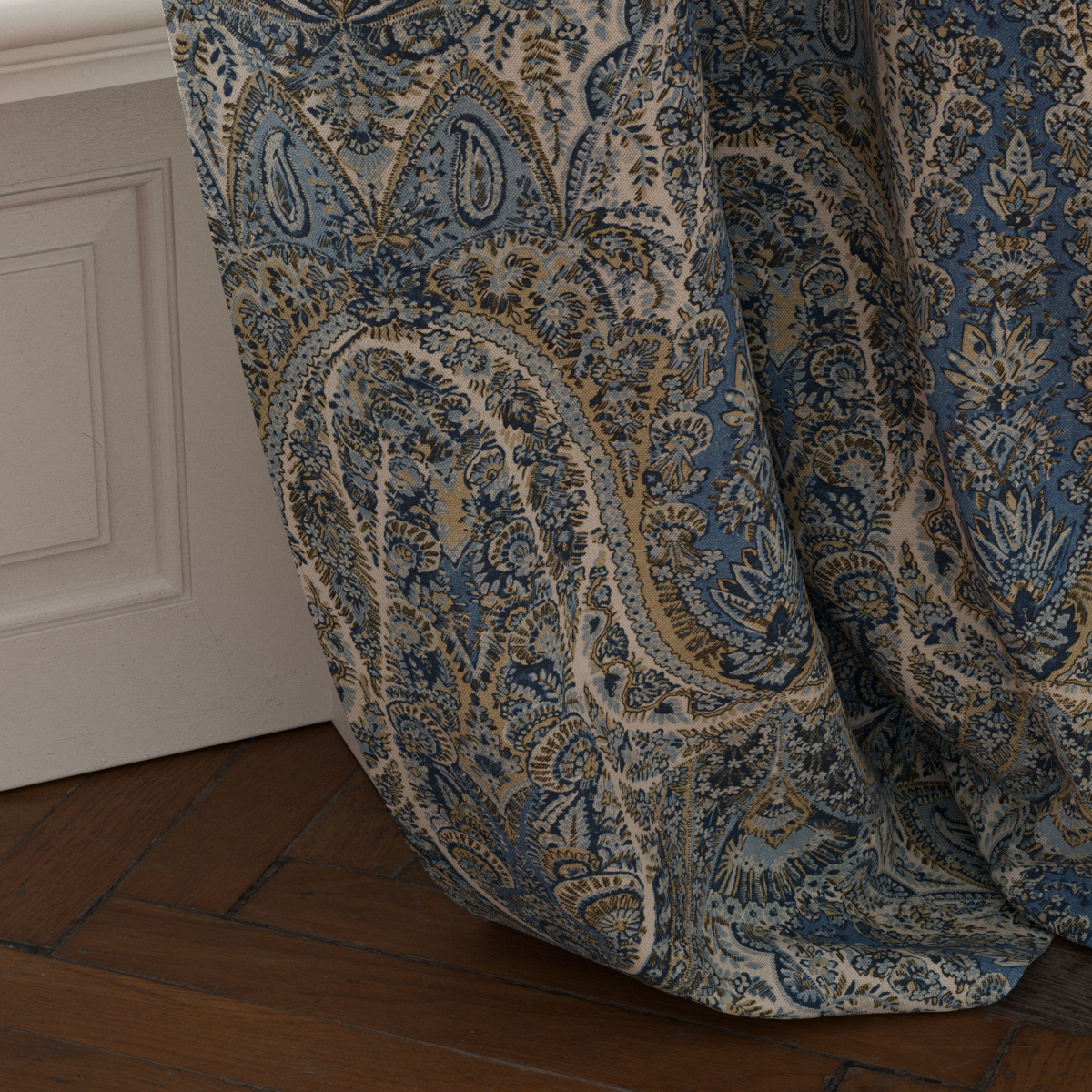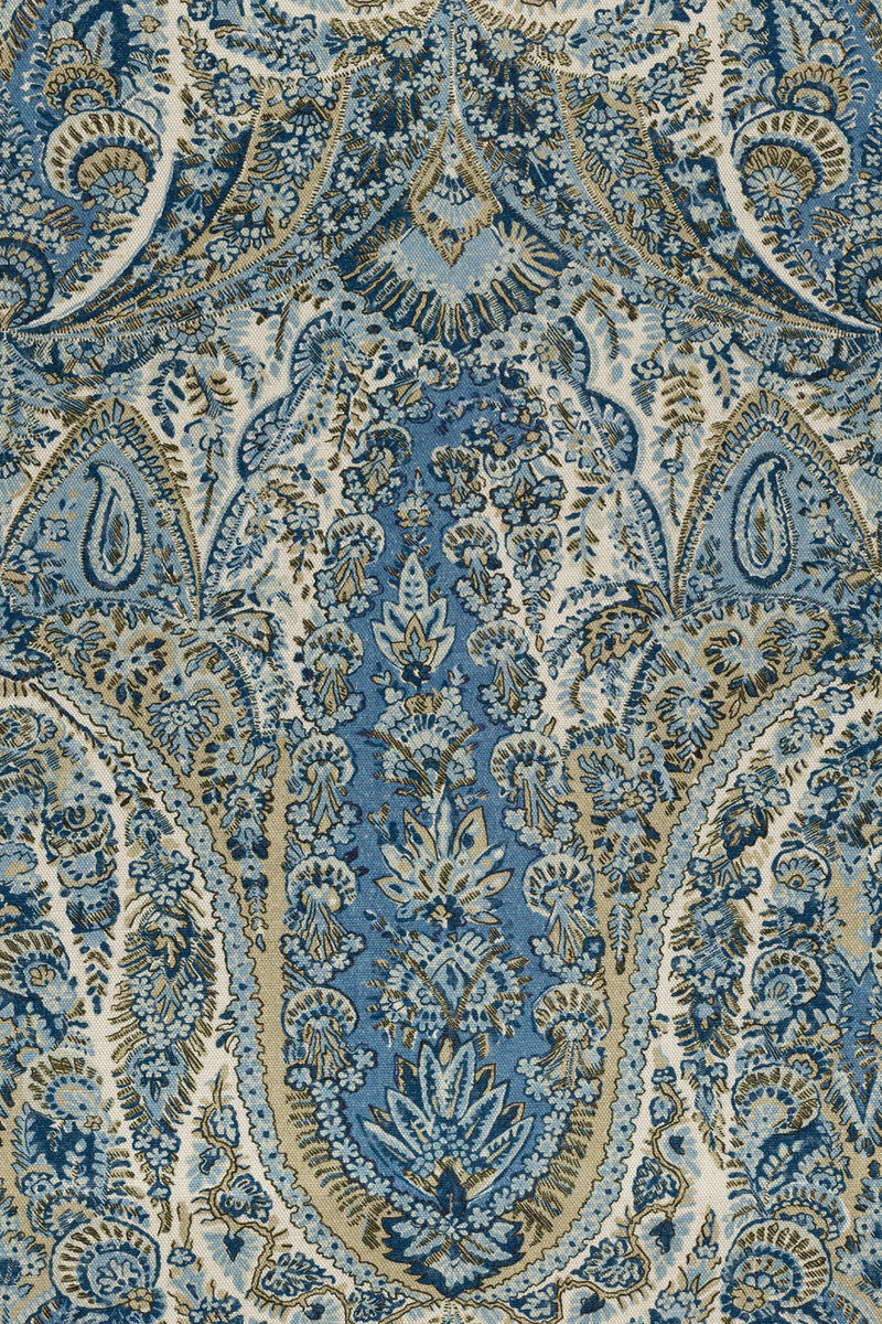 The inspiration for this elegant cashmere design came from the border pattern of an antique Persian shawl. The distinctively rich color effect is one of a kind, with each color composed of several different shades. The brilliant and finely detailed motifs are printed on a classic, natural semi-linen base.