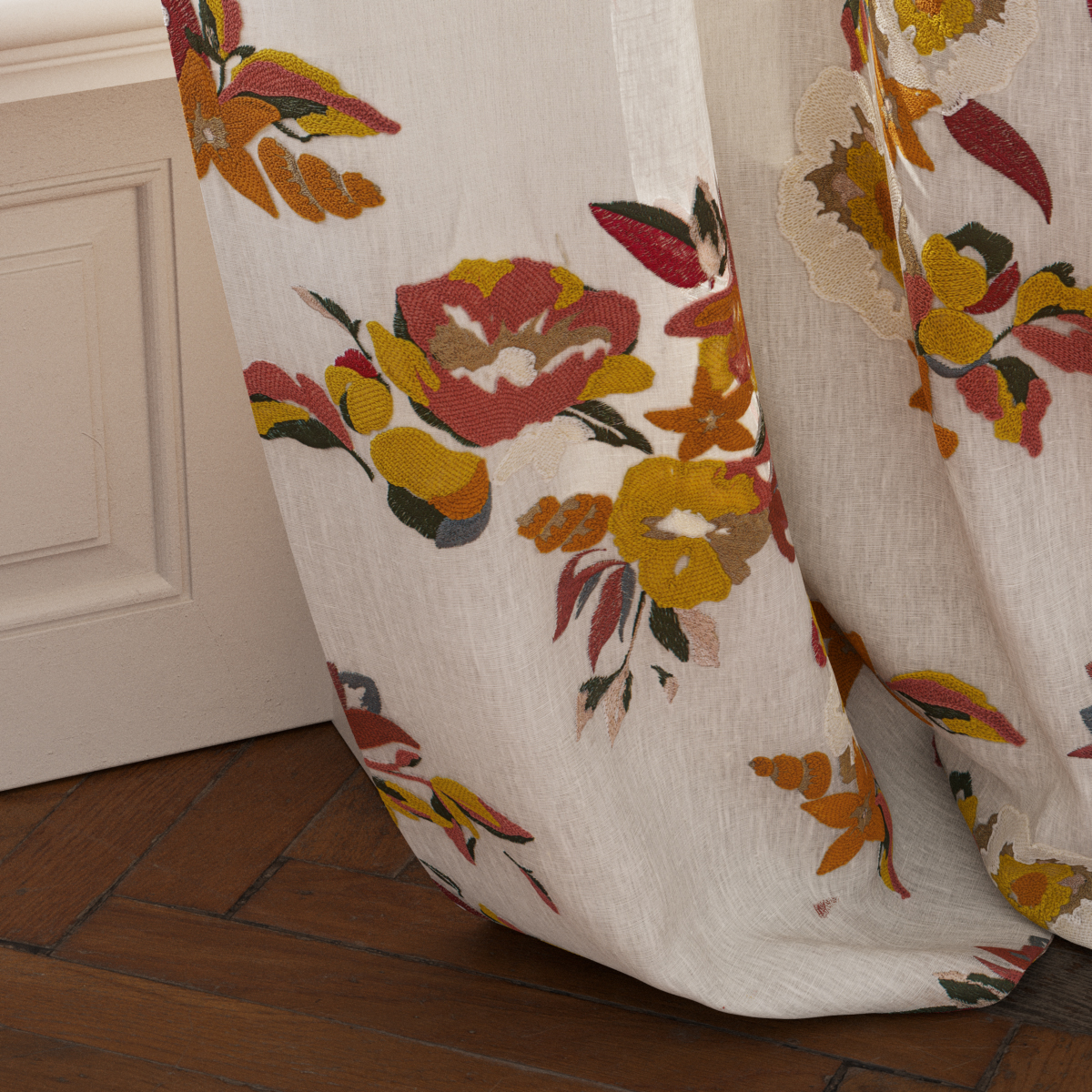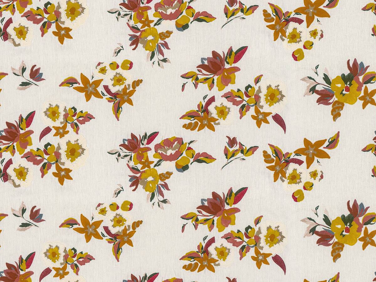 This embroidered 100%-linen fabric is a testament to Etamine Paris’ love of exuberant florals and colors. Poppies rhythmically weave and intertwine. The embroidery work here is a true art form and extremely time-consuming. Every detail is embroidered in chain stitch using a matte wool thread. The stitches delicately follow the direction of the shapes.