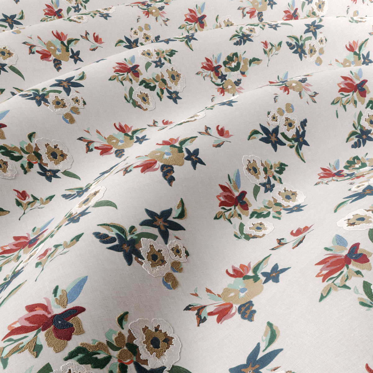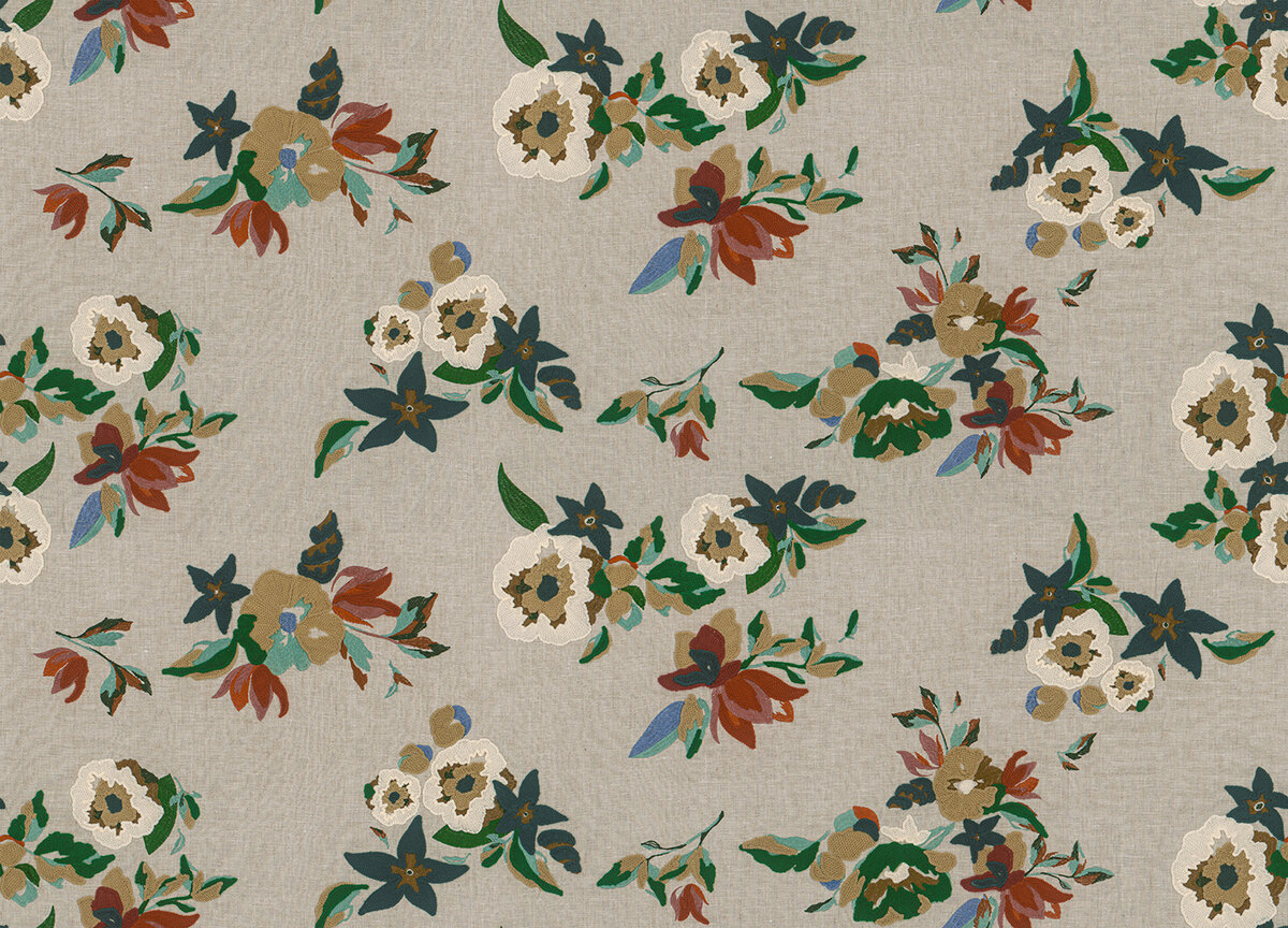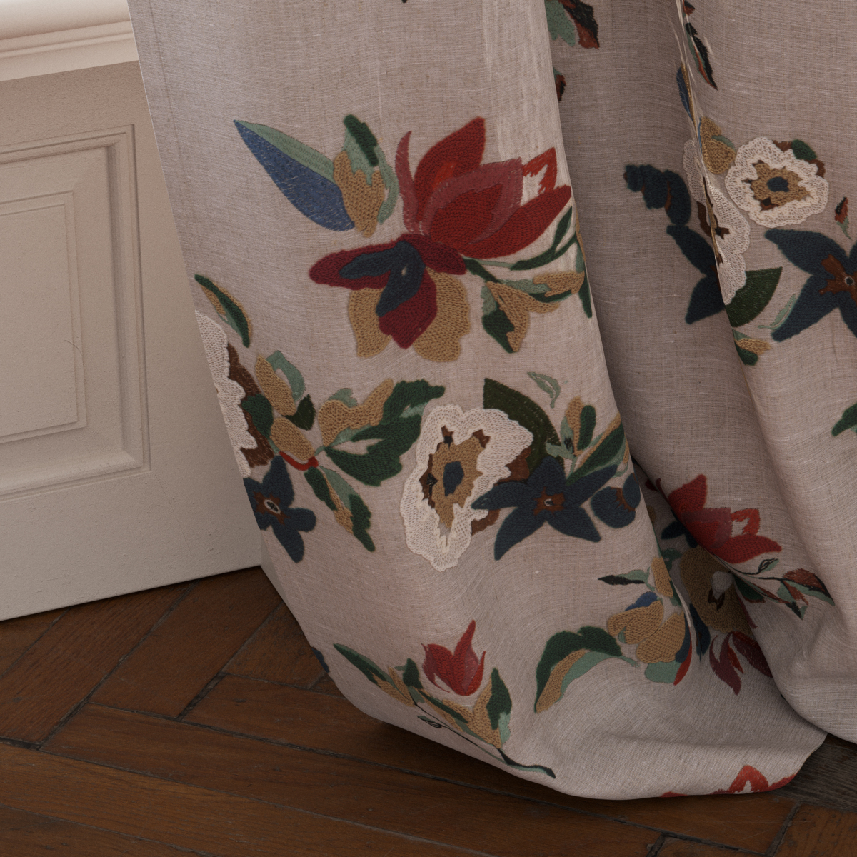 This embroidered 100%-linen fabric is a testament to Etamine Paris’ love of exuberant florals and colors. Poppies rhythmically weave and intertwine. The embroidery work here is a true art form and extremely time-consuming. Every detail is embroidered in chain stitch using a matte wool thread. The stitches delicately follow the direction of the shapes.