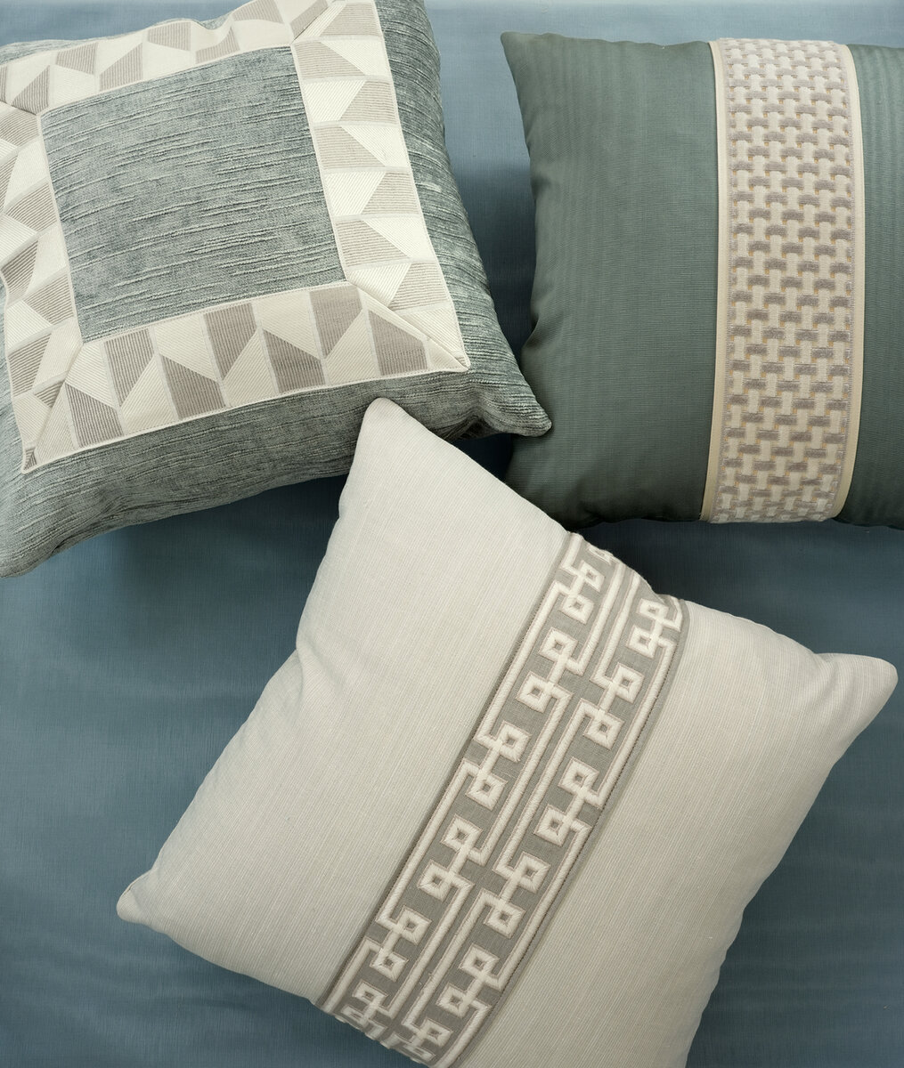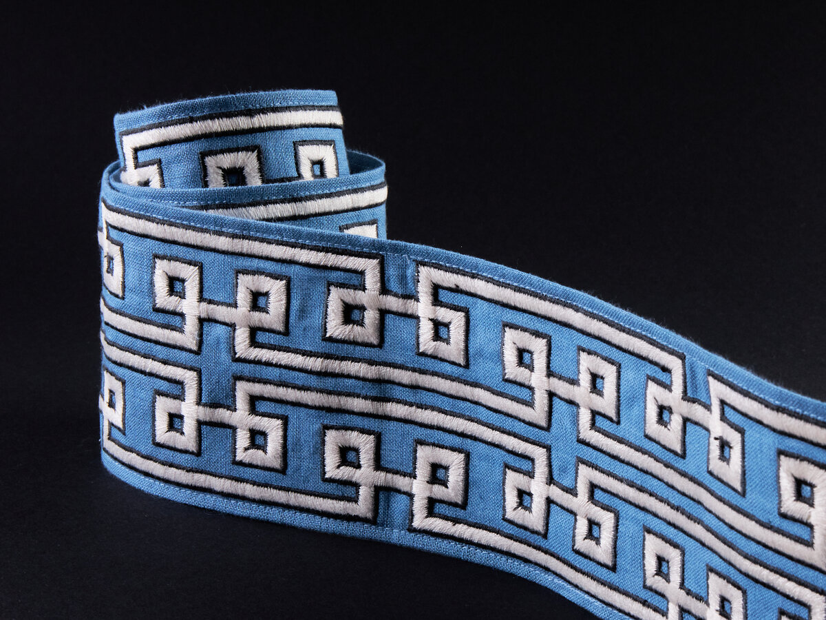 Classic in its interpretation, MEANDER TAPE adds a decorative Greek key border to the Travers tape portfolio. Composed of continuous lines embroidered using dry spun yarns, a 2D effect is used to produce added depth to this quintessential fret motif. Available in a palette of neutrals and blues, this timeless tape will be a perfect addition to any room.