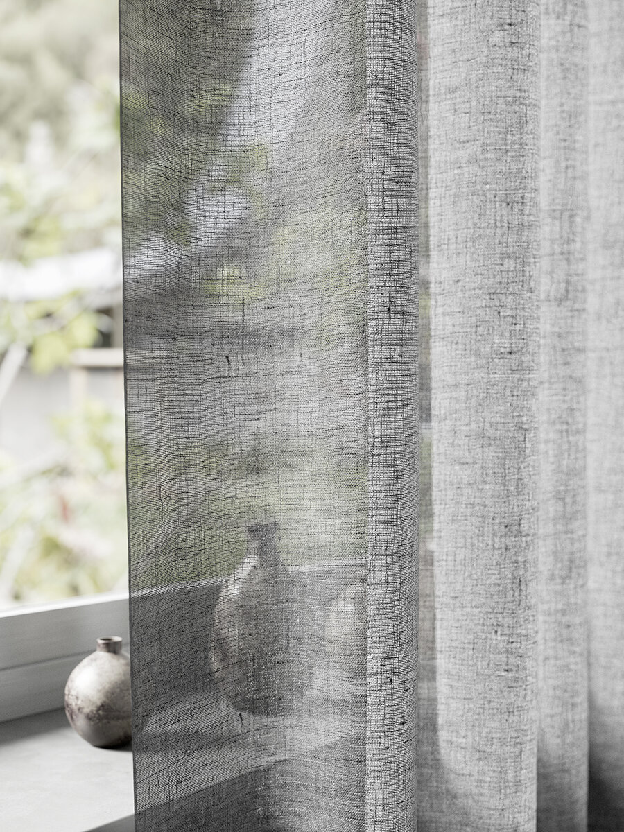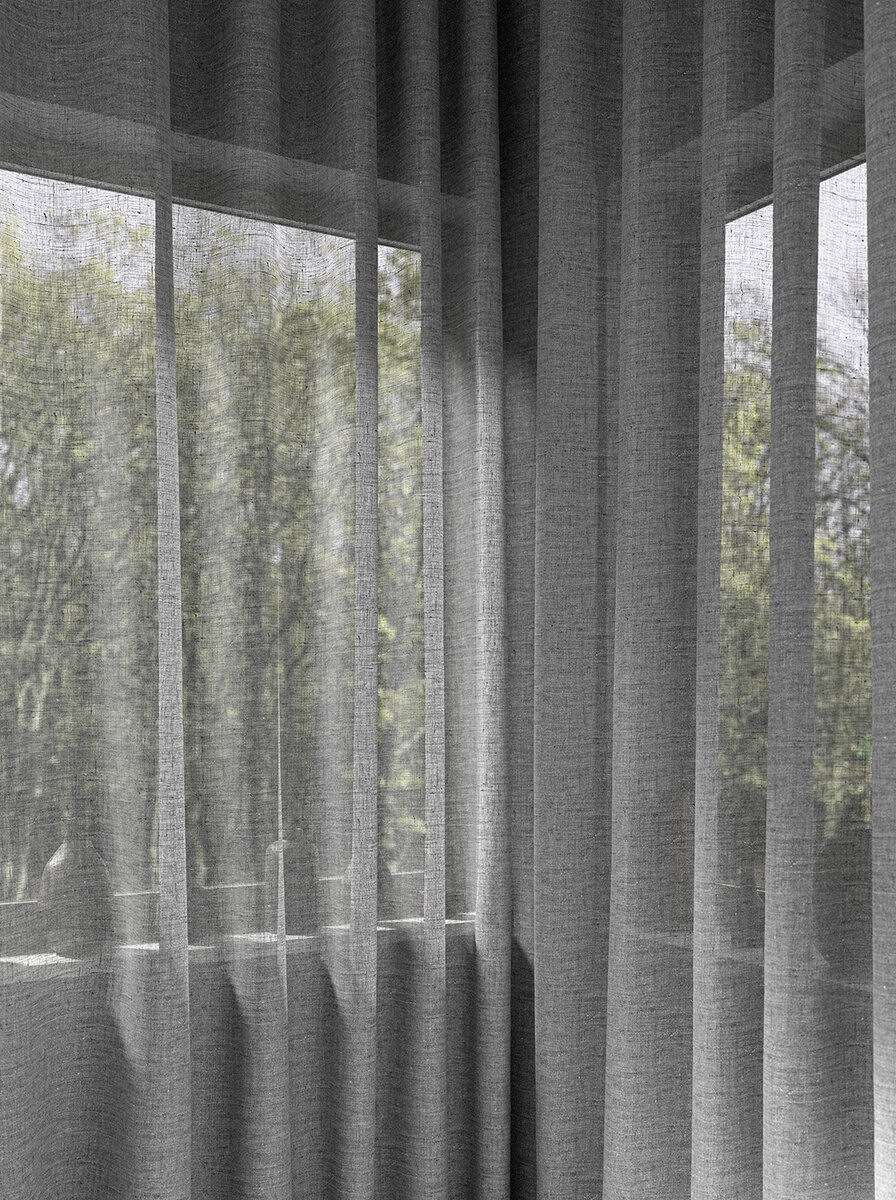 For this floor-to-ceiling transparent fabric, has the finest linen fibers combined to a two-colored mélange and woven in warp and weft, resulting in a lively structure. The pure and subtle beauty of this environmentally-friendly natural material reflects the soft color palette of modern neutrals.