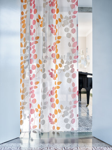 MERINA in orange/pink/cement and cream/beige/grey on a light background makes it seem like the sun has come to say hello to you in person, while cement/grey/beige on a smoky background gives a more mature aesthetic. The gradient of three harmoniously woven thread colours and the colourfully nonchalant irregularity on the modern tendril design make the floral Devoré stand out.