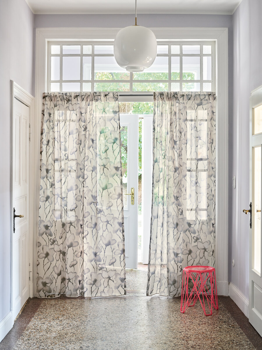 MERLIN is a light-hearted, delicate floral design on a flame-retardant base fabric. The hand-painted watercolour of flowers is digitally printed onto the transparent fabric ARTUS with artistic brush strokes. The brilliant print inspires in a feminine, neutral as well as masculine ambience created by the colours.