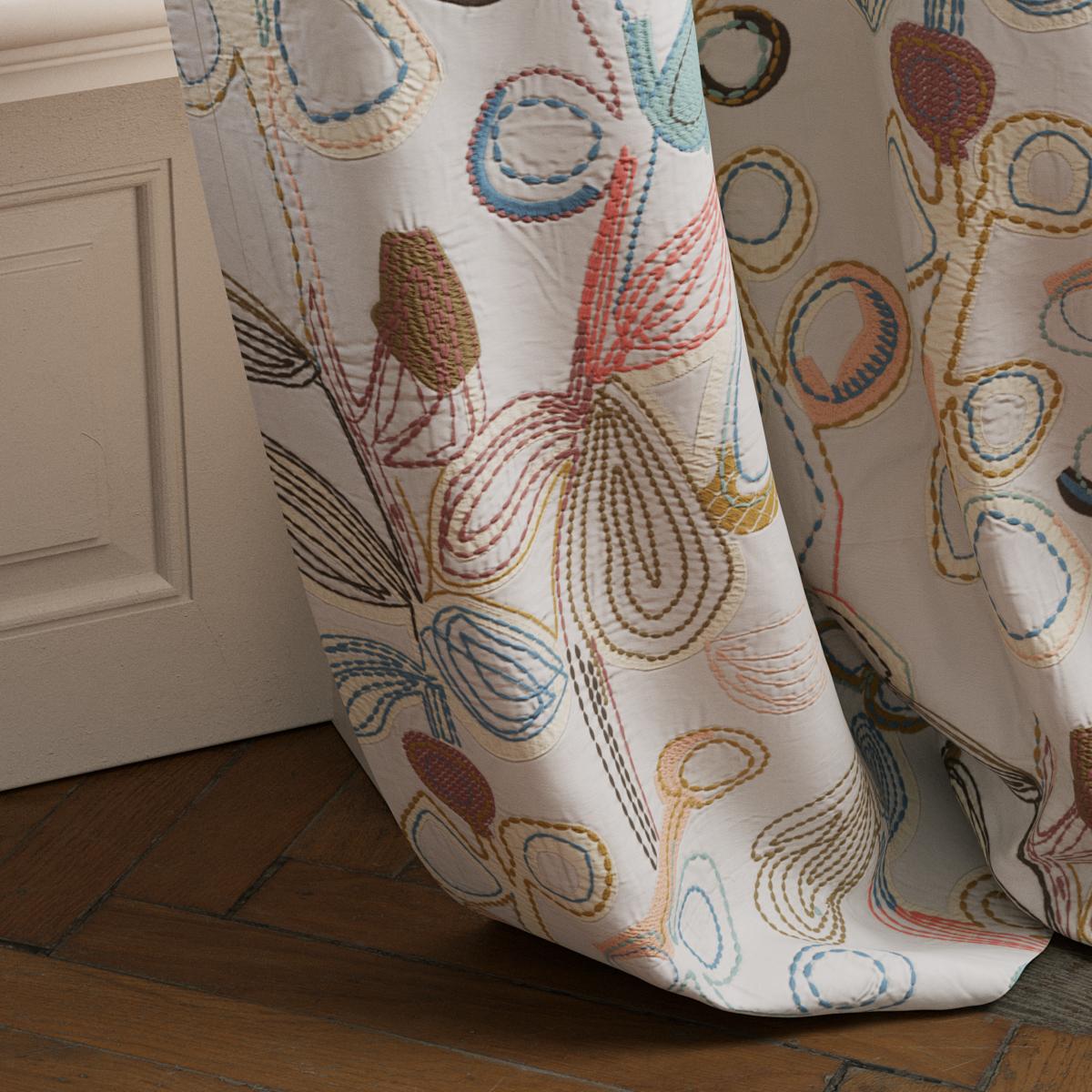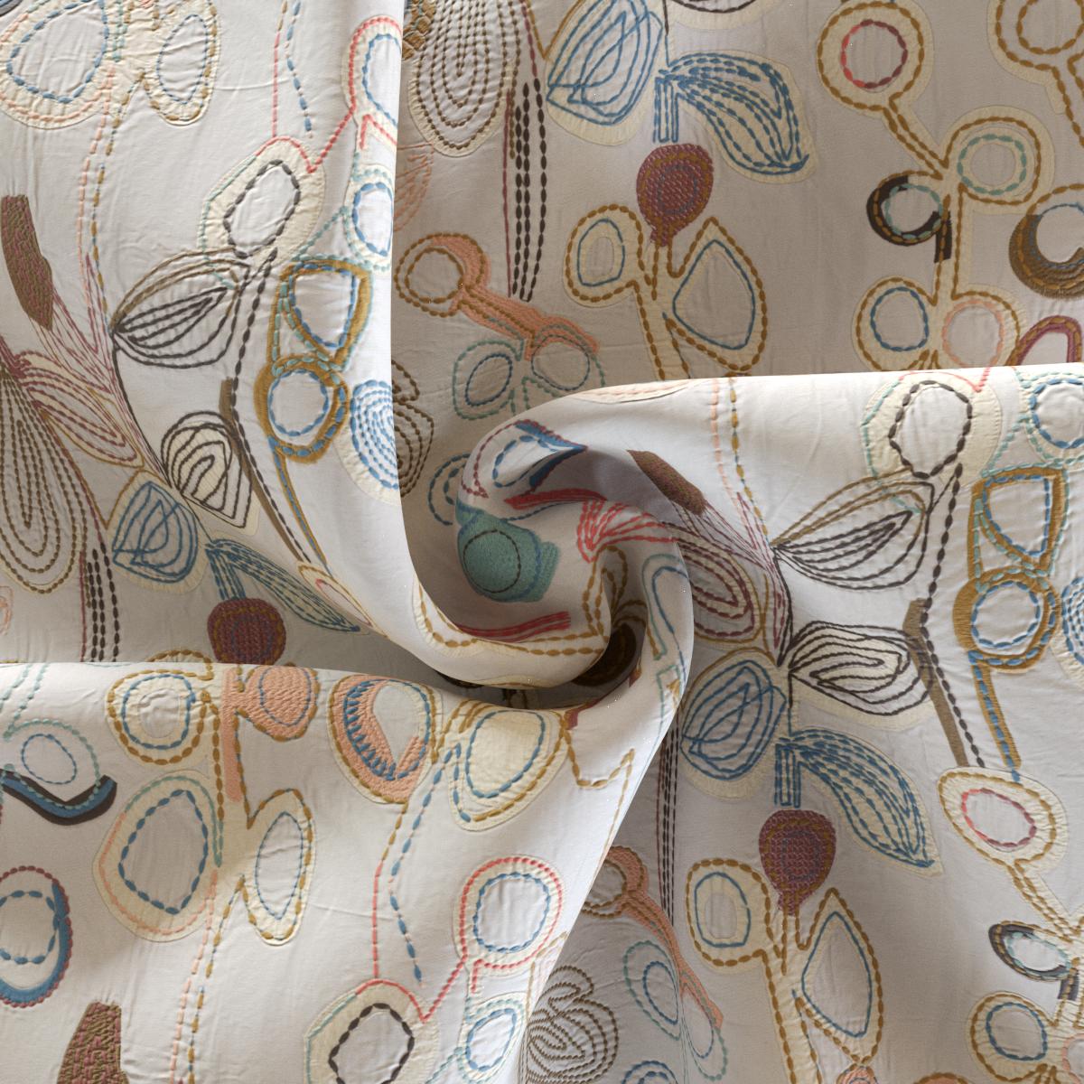 This fresh, all-over design—adorned with thoughtfully placed embroidery—captures the decorative richness of a garden in full bloom. Set against softly shimmering cotton satin, hand-drawn lines come to life through embroidery in varying expressions: some outlined with delicate precision, others fully appliquéd to create depth and contrast.