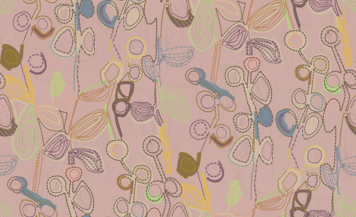 The subtle irregularities of the stitching give the pattern a painterly quality—a dynamic interplay of lines, surfaces, and textures reminiscent of botanical sketchbook studies. The result is a fabric alive with movement, detail, and character.