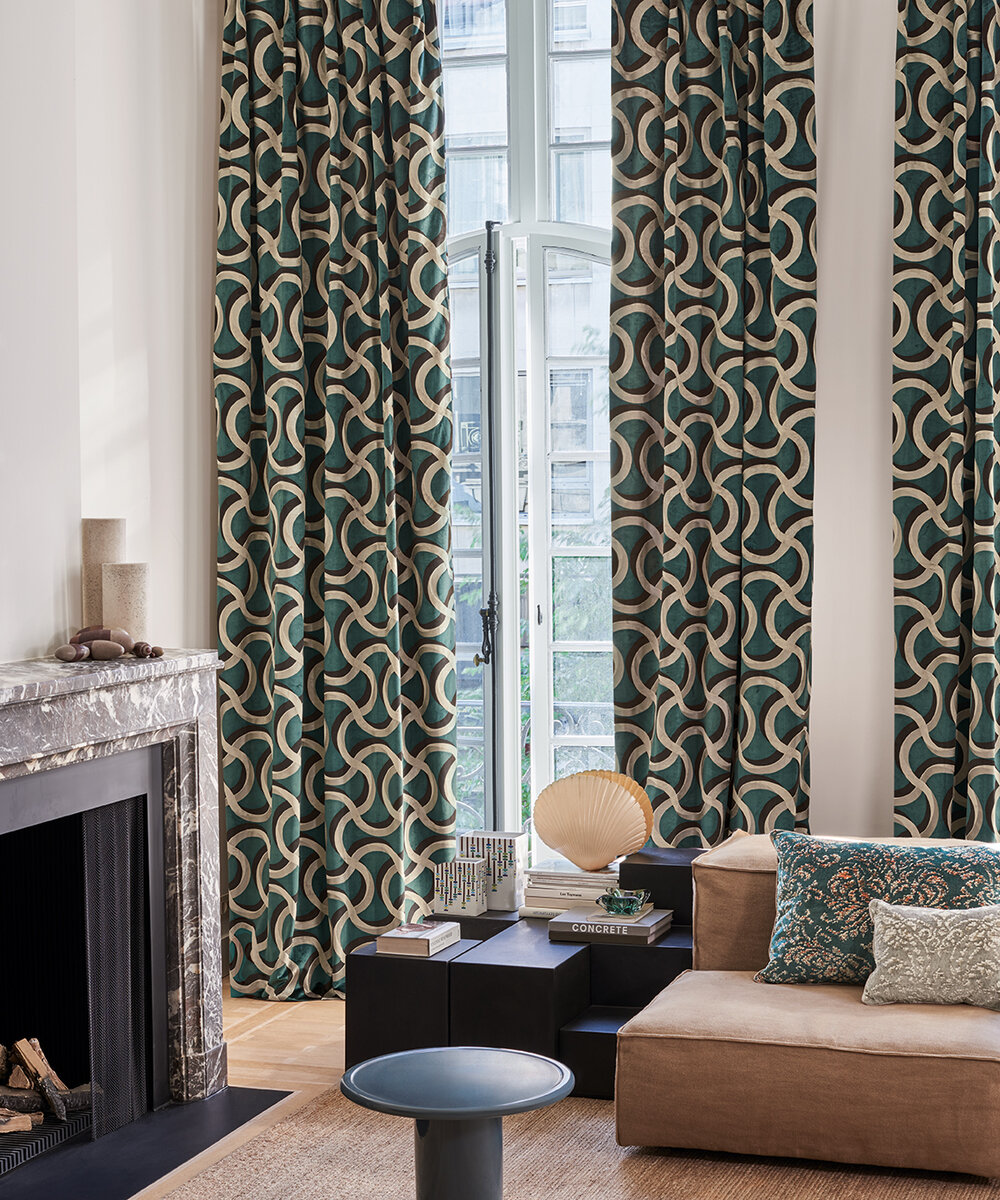 This prestigious and wonderfully decorative print was inspired by architectural elements from the Golden Twenties. The soft, flowing velour background and the elegant, shimmering motifs come together with an effortless sophistication that underscores the rhythmic sensation created by the pattern. The elegant colour palette allows the vibrant interplay of the colours to shine through, making MOVIMENTO a true highlight in any sophisticated interior design scheme.