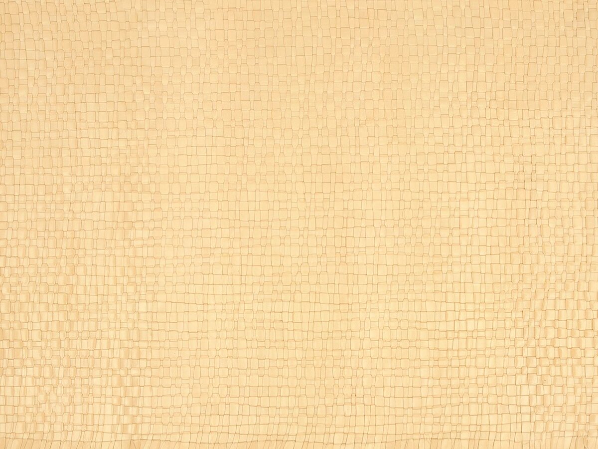 An attractive, striking leather network, with interwoven leather bands of varying width. This exquisite leather weave with its special characteristic irregularity looks hand woven and requires particularly elaborate preparat ion and production processes. The hides are cut into irregular bands for warp and weft. A special cutting method is used for the weft. In order to create as few lengths as possible the hide is stretched on a cutting machine and cut into bands in a spiral fashion. Special looms are used for drawing-in the long leather bands and putting them under tension. During this process it is important to avoid twisting the leather bands, both during mounting on the loom and weaving. Subsequently the network is attached to a cotton backing in order to ensure sufficient stability for processing.