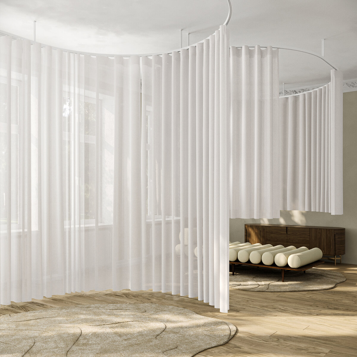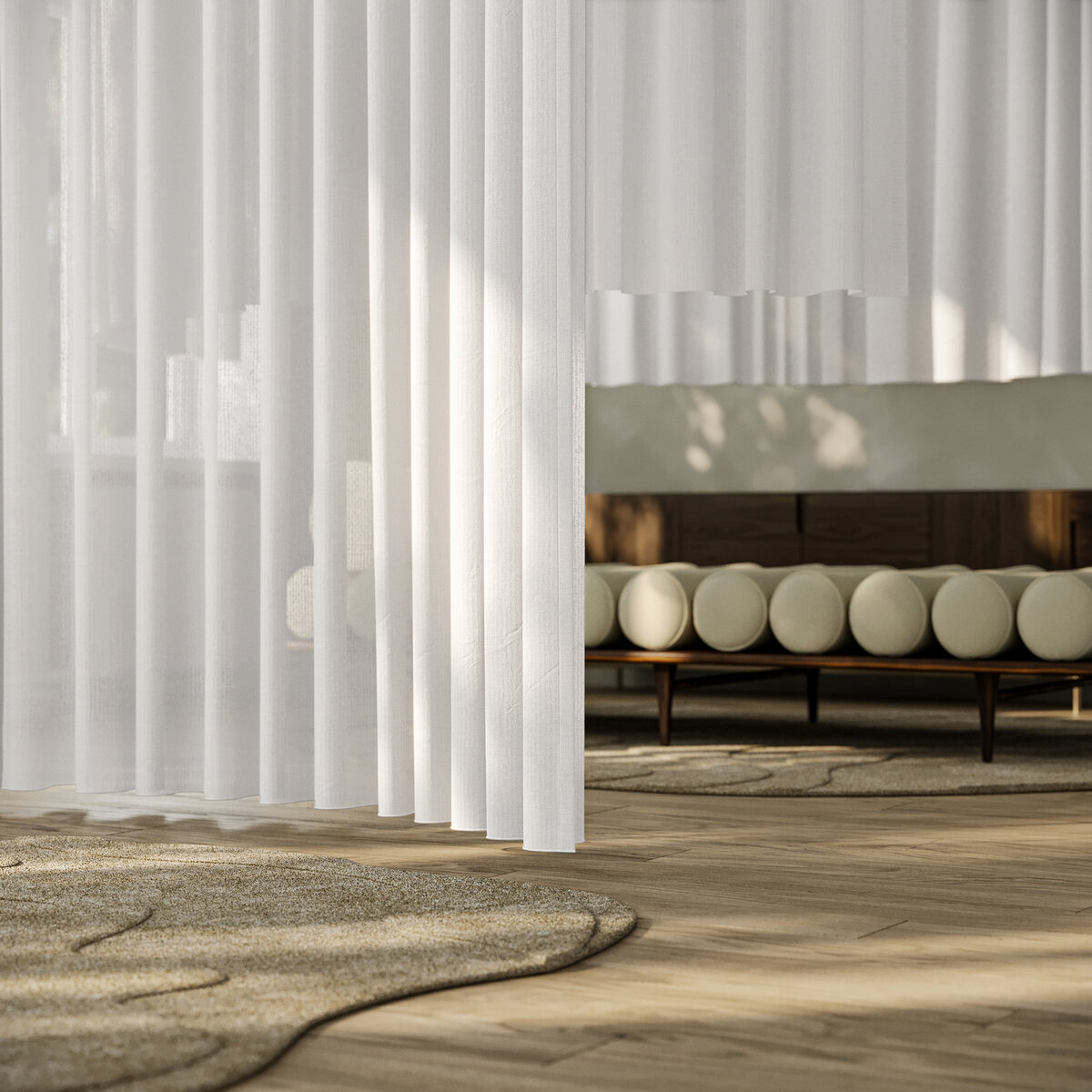 Three-dimensional fabric that is subtle and voluminous. The harmonious texture of our NOE fabric creates an atmosphere of serenity in any room. The airflow finish gives the transparent fabric softness and volume. Other key features include the 3D weaving technique, recycled polyester, and the easy-care experience.