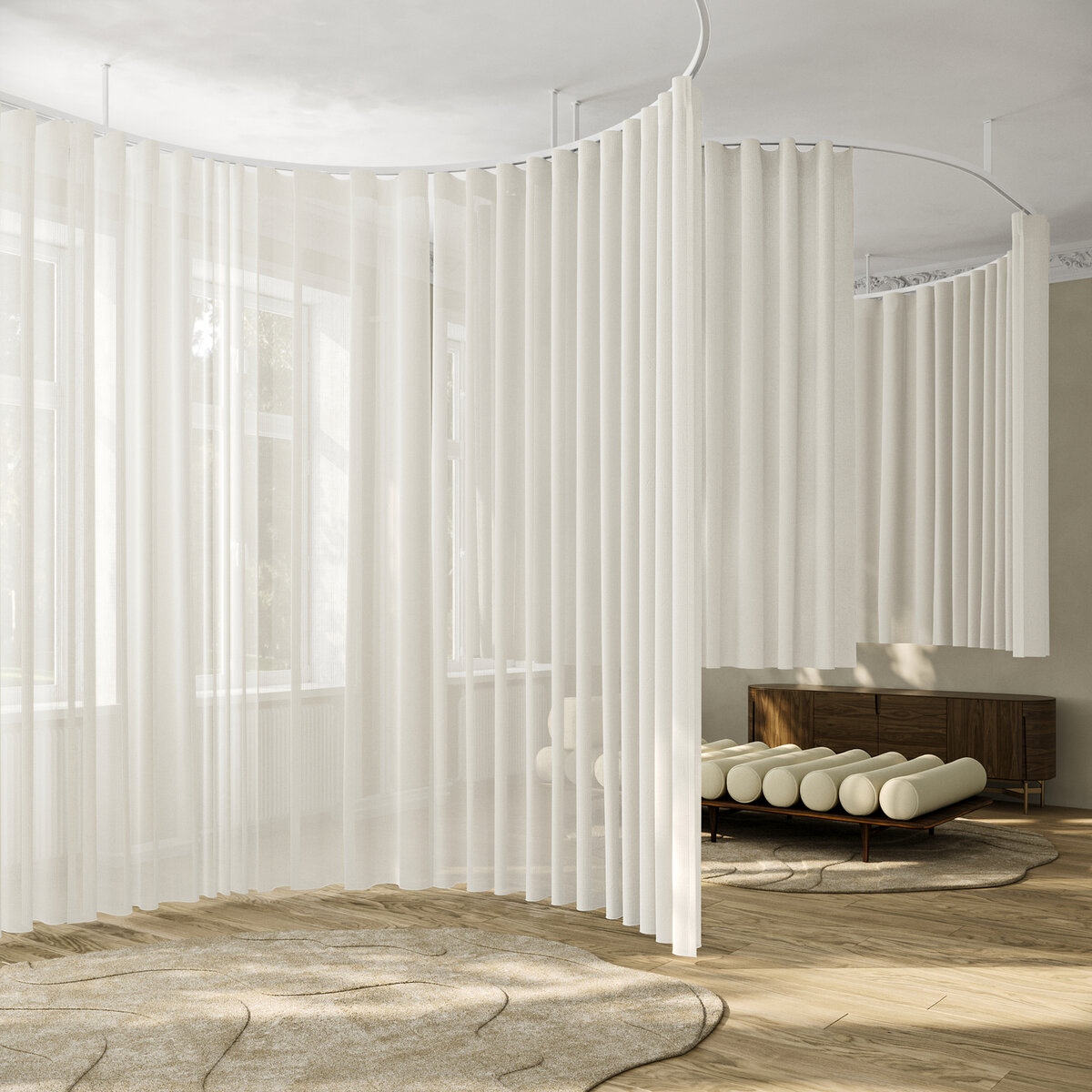 Three-dimensional fabric that is subtle and voluminous. The harmonious texture of our NOE fabric creates an atmosphere of serenity in any room. The airflow finish gives the transparent fabric softness and volume. Other key features include the 3D weaving technique, recycled polyester, and the easy-care experience.
