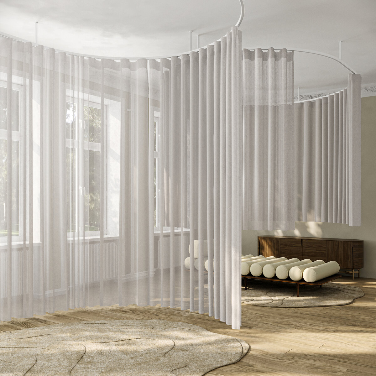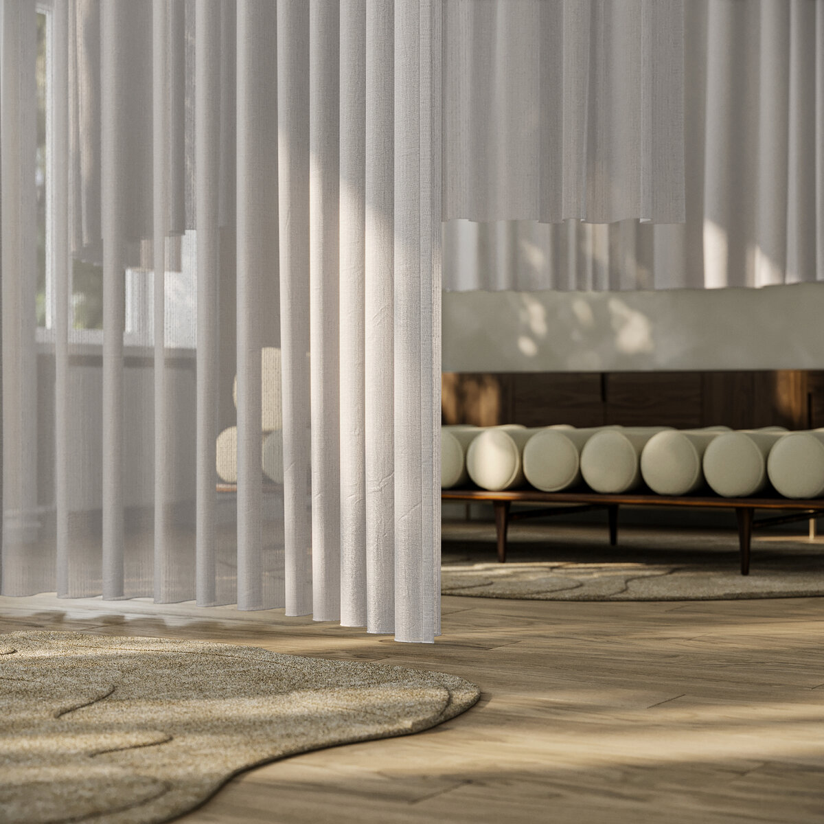 Three-dimensional fabric that is subtle and voluminous. The harmonious texture of our NOE fabric creates an atmosphere of serenity in any room. The airflow finish gives the transparent fabric softness and volume. Other key features include the 3D weaving technique, recycled polyester, and the easy-care experience.