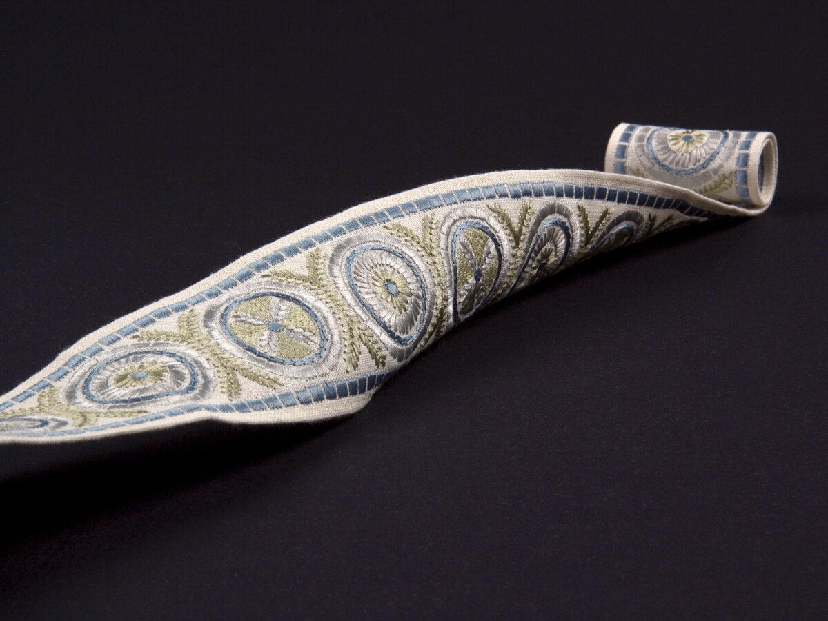 Multi-coloured embroidery thread shows off the variety of stitches used to complete this whimsical, stylized floral medallion. The slight sheen of the viscose thread contrasts nicely with the dry linen ground tape.