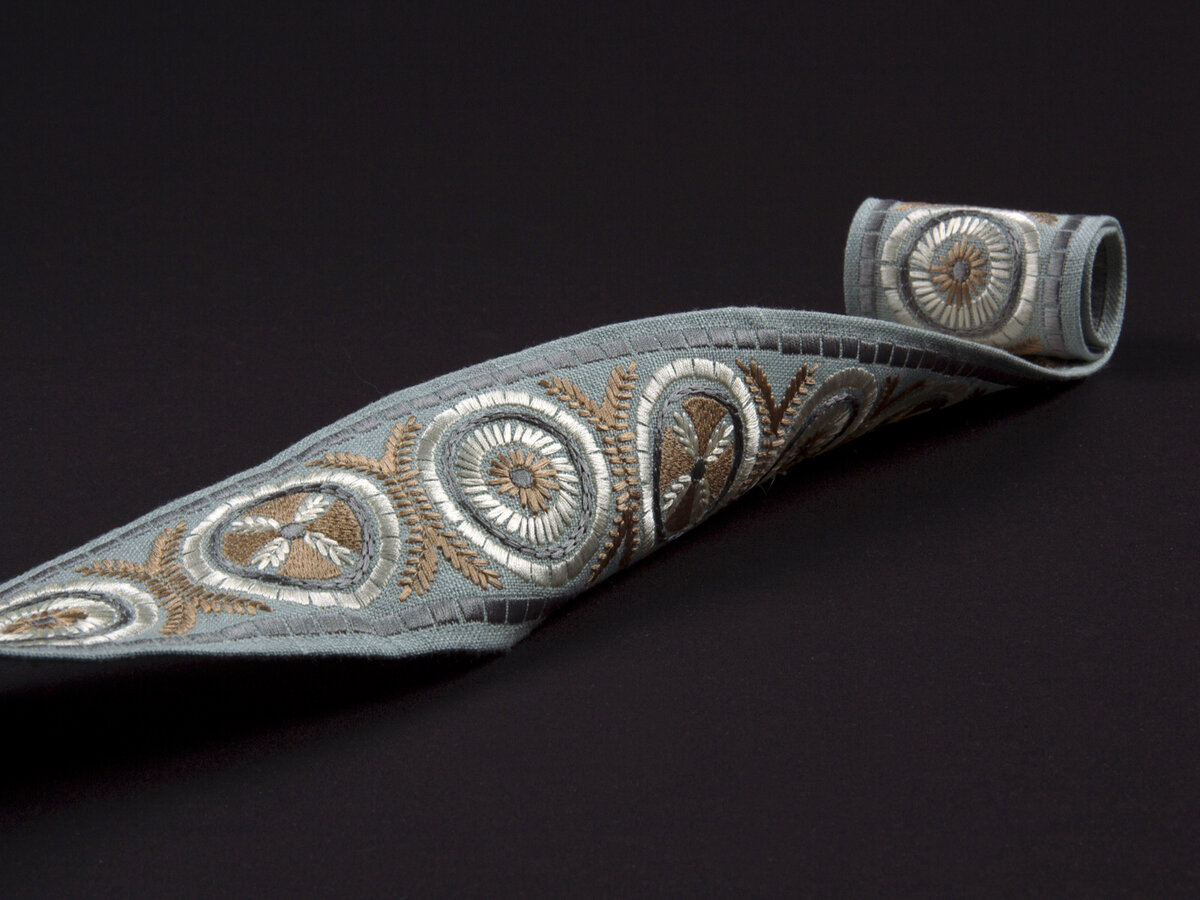 Multi-coloured embroidery thread shows off the variety of stitches used to complete this whimsical, stylized floral medallion. The slight sheen of the viscose thread contrasts nicely with the dry linen ground tape.