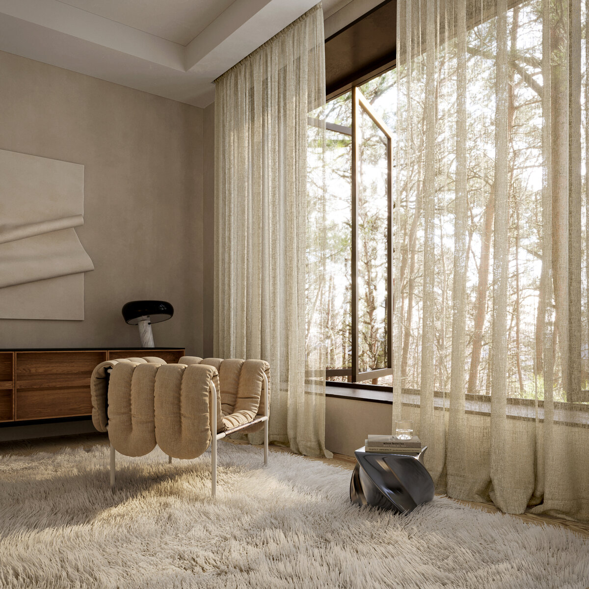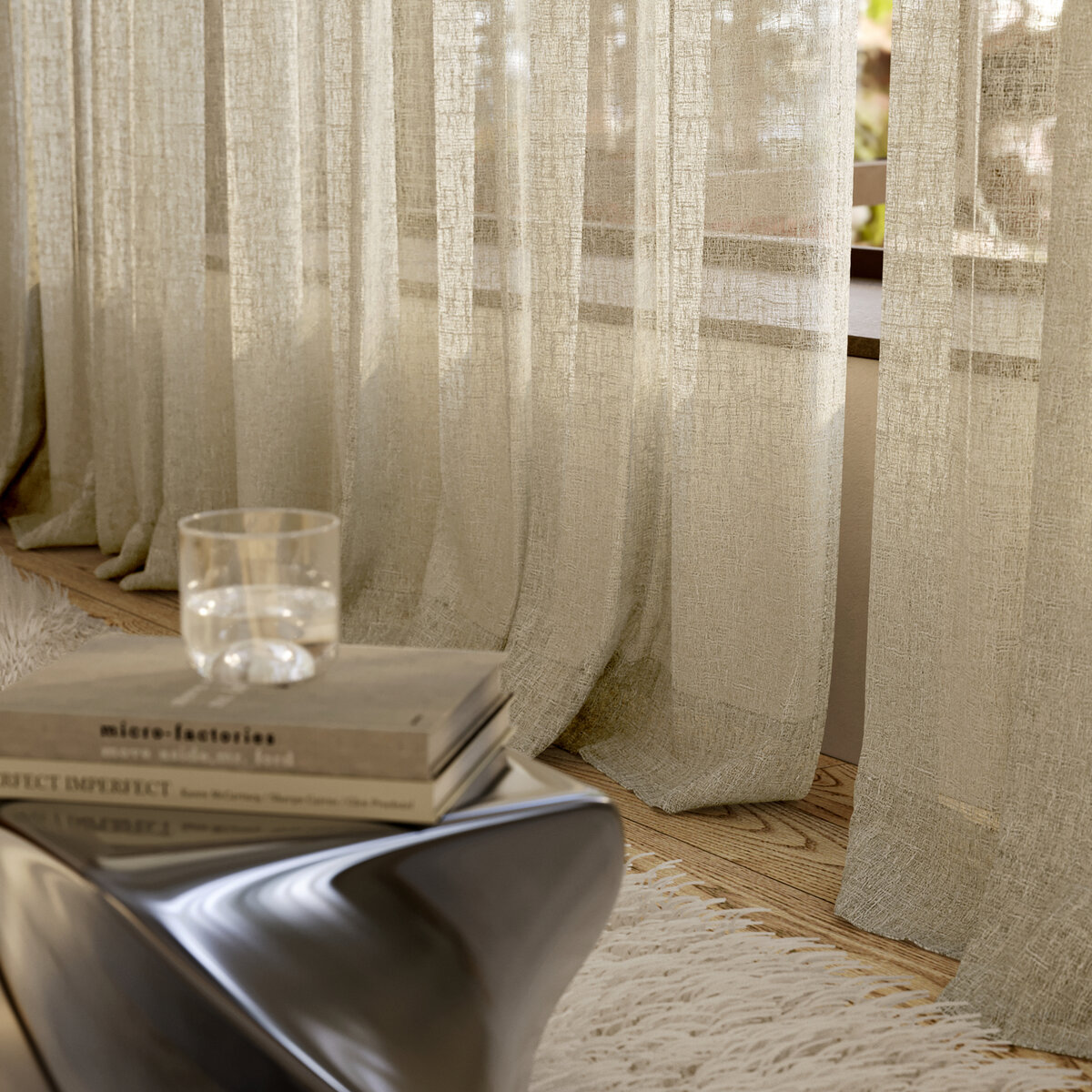 Ooh OOLONG! This sheer fabric’s raw, natural texture is beautifully dramatized by sunlight. In these moments, OOLONG’s own materiality – a blend of 53% BCI cotton and 42% recycled polyester – is revealed in all its splendor, underscoring the surrounding architecture of concrete, steel, wood, and glass. The natural tones further emphasize the unique character of this fabric.
