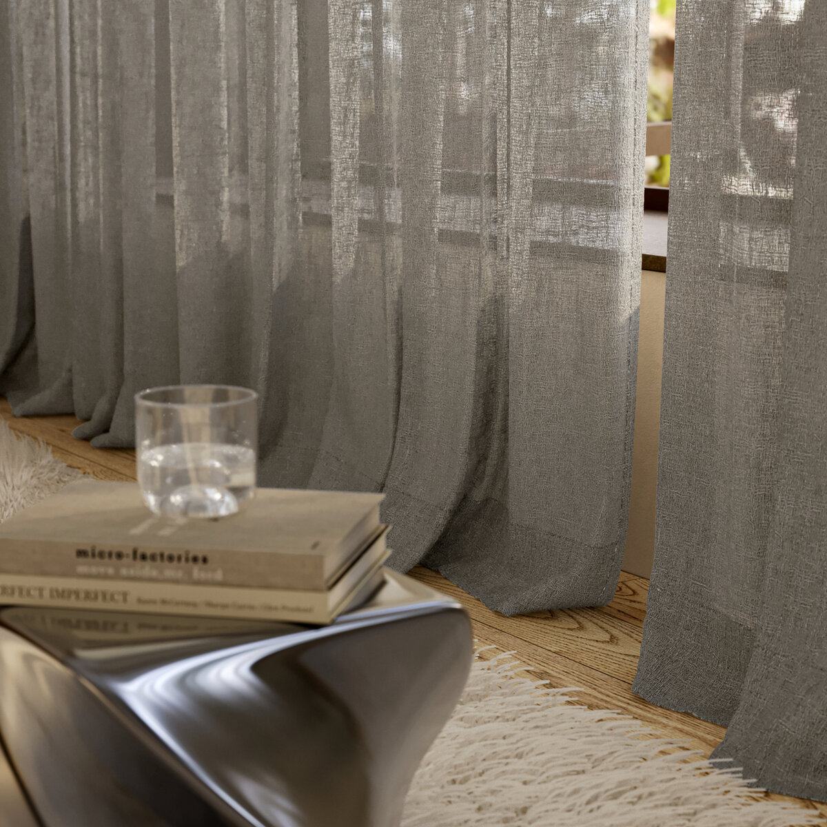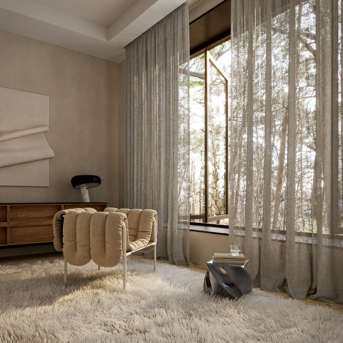 Ooh OOLONG! This sheer fabric’s raw, natural texture is beautifully dramatized by sunlight. In these moments, OOLONG’s own materiality – a blend of 53% BCI cotton and 42% recycled polyester – is revealed in all its splendor, underscoring the surrounding architecture of concrete, steel, wood, and glass. The natural tones further emphasize the unique character of this fabric.