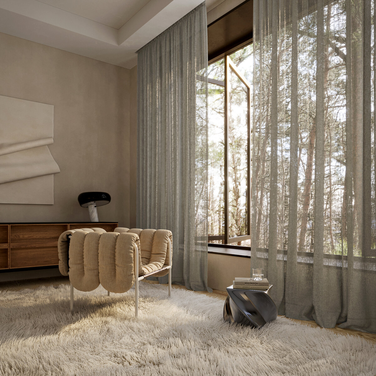 Ooh OOLONG! This sheer fabric’s raw, natural texture is beautifully dramatized by sunlight. In these moments, OOLONG’s own materiality – a blend of 53% BCI cotton and 42% recycled polyester – is revealed in all its splendor, underscoring the surrounding architecture of concrete, steel, wood, and glass. The natural tones further emphasize the unique character of this fabric.
