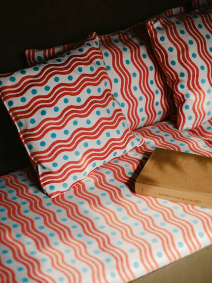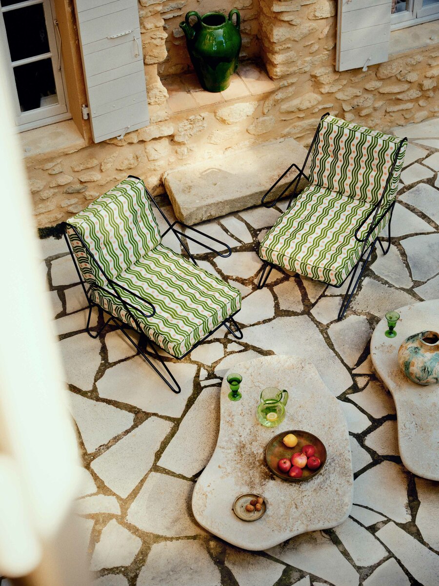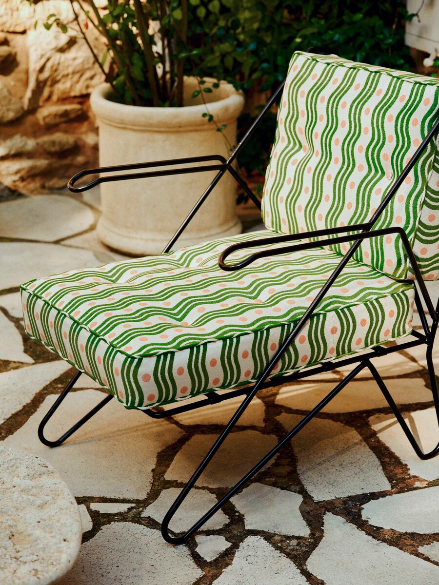 OUTREMER, woven in Italy, features a gently undulating motif reminiscent of the sculptural curves of 1950s furniture photographed by Jacques-Henri Lartigue along the French Riviera.