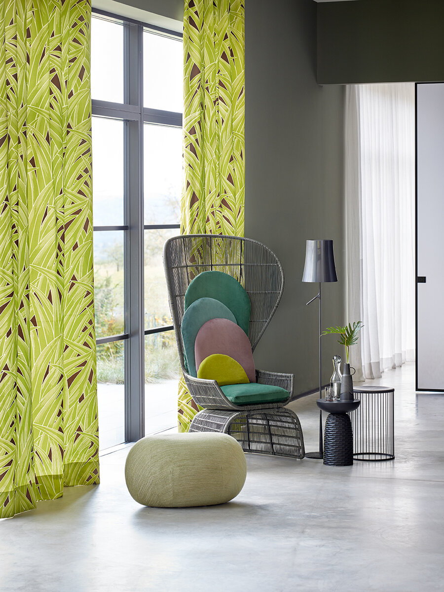 PALMHOUSE is inspired by the lush thicket of plants found in tropical hothouses. The abstract imagery and clear, contrasting colouring of the aloe vera leaves help produce the dynamic design of the lavish print motif as well as its appealing allover effect, which make it easy to integrate into any modern room concept.