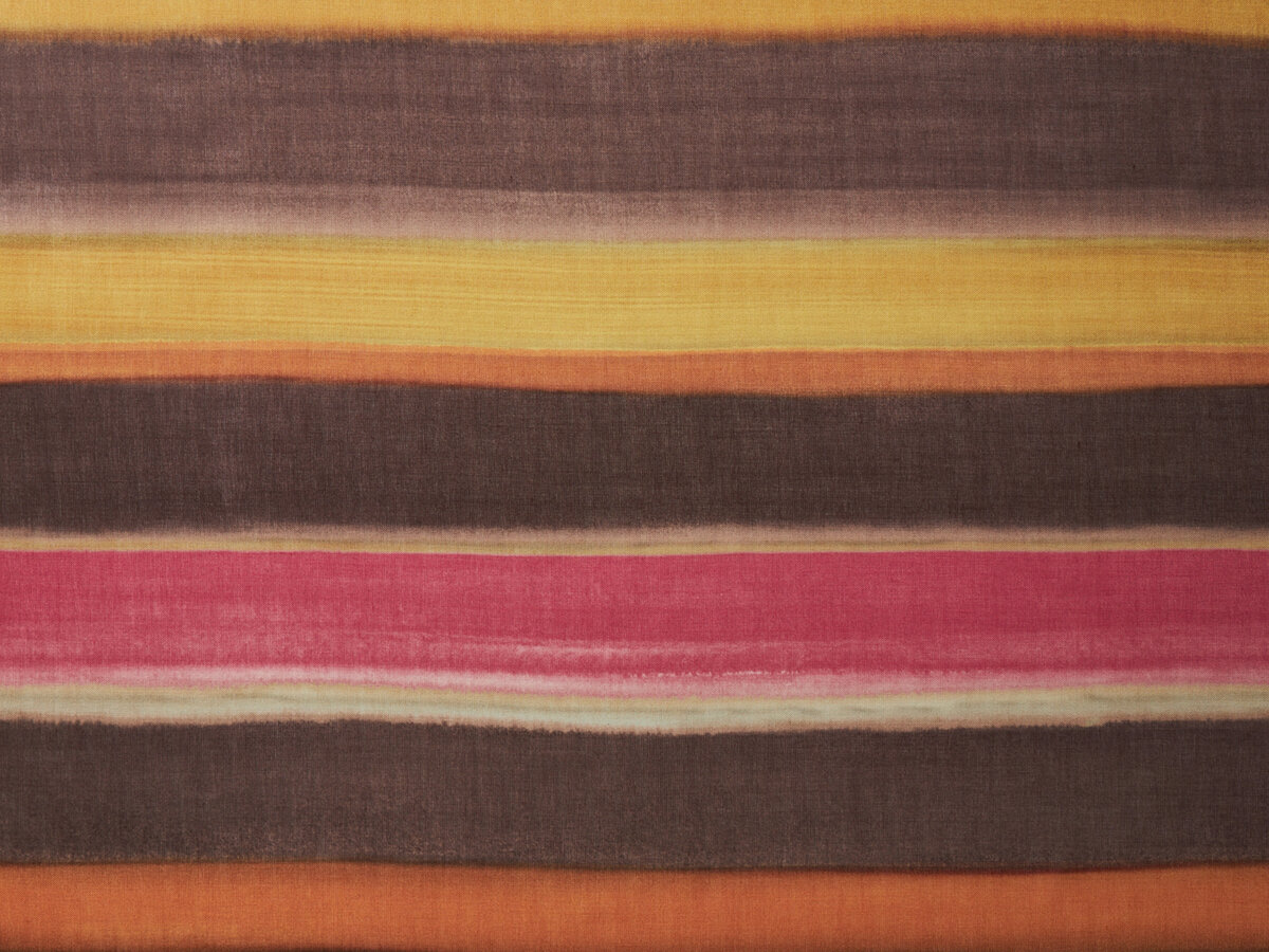Like a blurred landscape in the distance or a flickering mirage, PANORAMA RE FR plays with a vibrating colour gradient. Watercolour stripes form the base of the panel design and continue towards the top. The repeat extends over the entire height of the fabric and runs endlessly widthways.