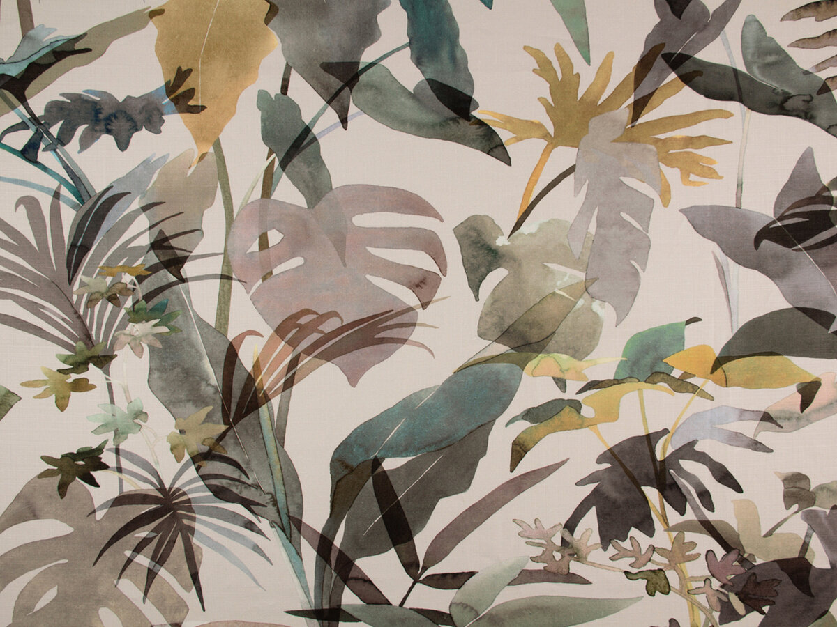 Paradiso speaks to lush tropics and opulence. Imaginative watercolour-style leaf motifs are layered over one another like plants in a jungle. Whether it is placed against a light or a dark backdrop, this relaxed linen print makes a strong statement at your window.