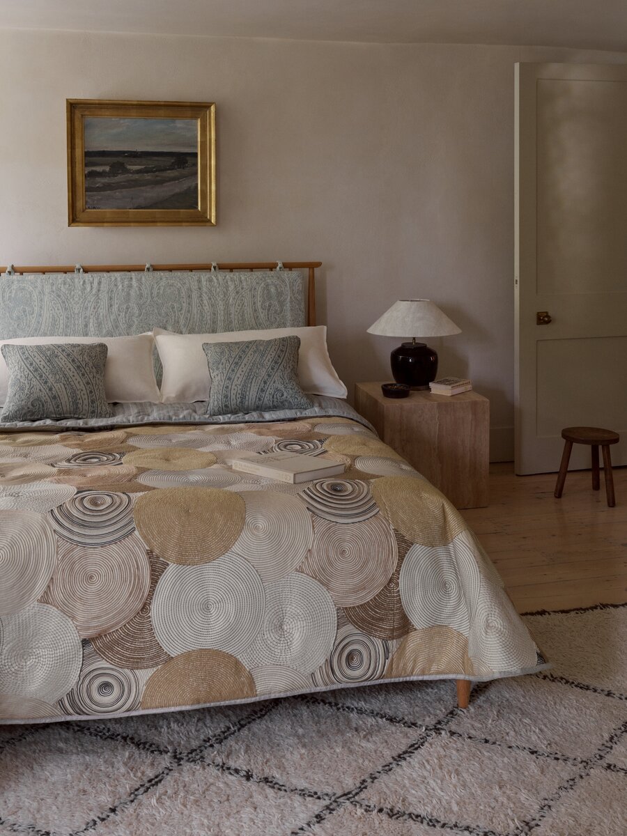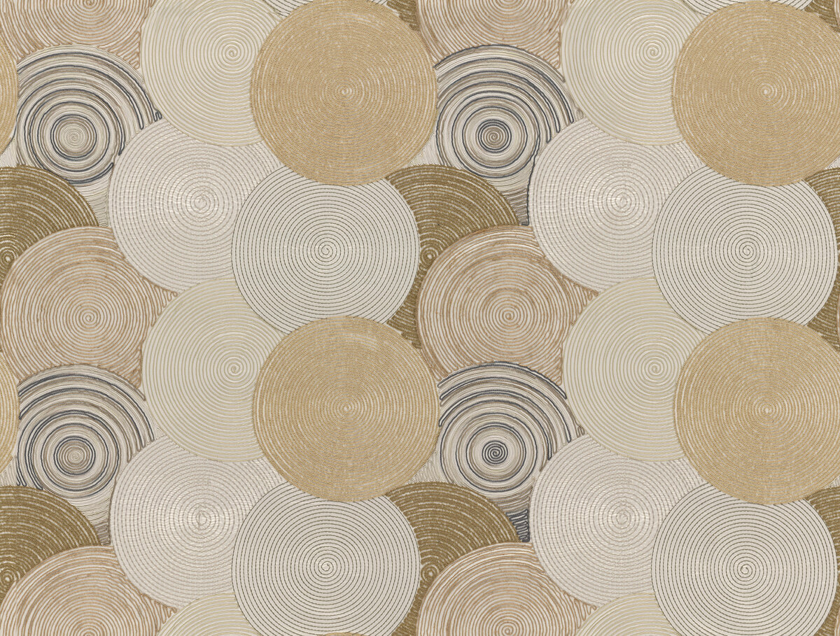 Semi-symmetrical spheres of contrasting embroidery techniques in a variety of matte, semi-sheen, and space-dyed yarns play together to recreate the effect of formal parterre gardens, where paths weave through a variety of landscapes. Jute, bouclé and space-dyed cording interact in this creative and technical decorative embroidery.