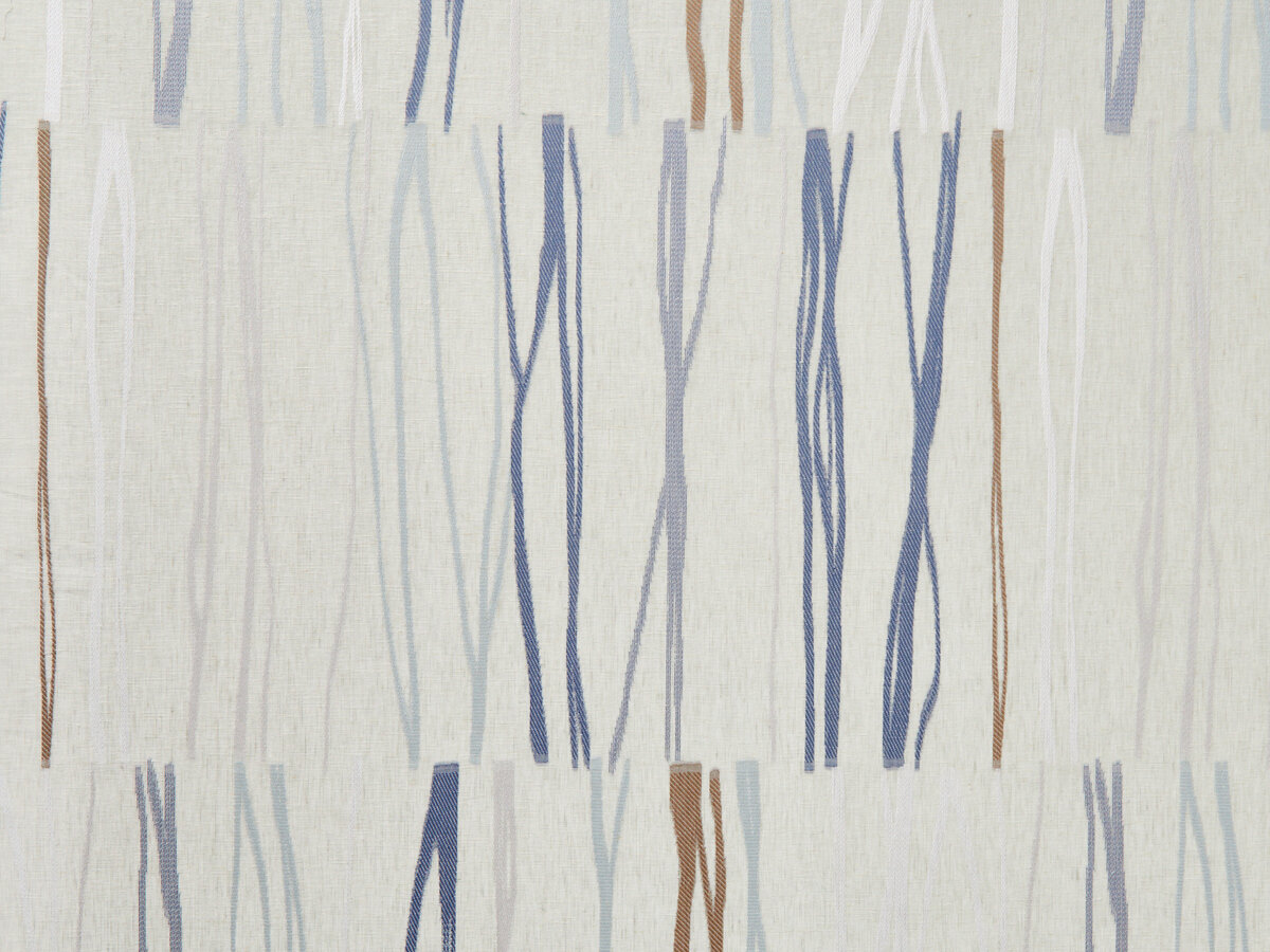 Hand-drawn pastel chalk lines in soft shades follow a vertical rhythm reminiscent of bundled raffia fibers. The natural-looking design is woven using the Scherli technique on a transparent half-linen base fabric.