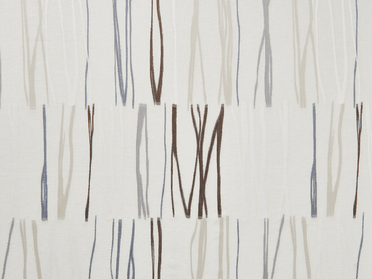 Hand-drawn pastel chalk lines in soft shades follow a vertical rhythm reminiscent of bundled raffia fibers. The natural-looking design is woven using the Scherli technique on a transparent half-linen base fabric.