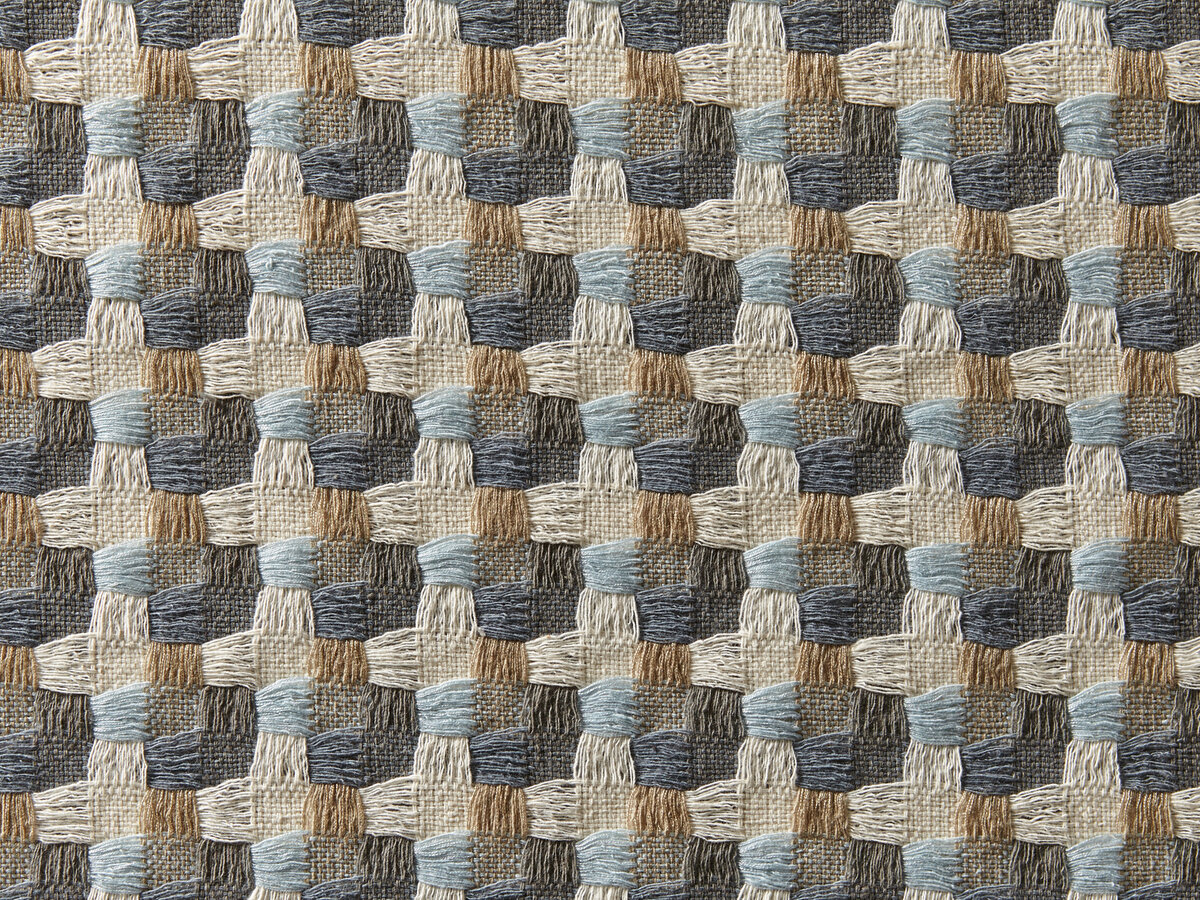 A magnified houndstooth pattern. All will appreciate the weaving process used to create this handcrafted woven fabric. The warp and weft are clearly recognisable and form a wonderful blend of colours; a lovely complement to the other fabrics in this summery collection. Its name reveals the inspiration for its style - the tile pattern of a Mediterranean patio.