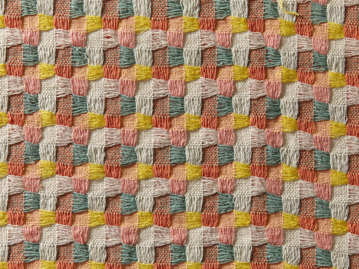 A magnified houndstooth pattern. All will appreciate the weaving process used to create this handcrafted woven fabric. The warp and weft are clearly recognisable and form a wonderful blend of colours; a lovely complement to the other fabrics in this summery collection. Its name reveals the inspiration for its style - the tile pattern of a Mediterranean patio.