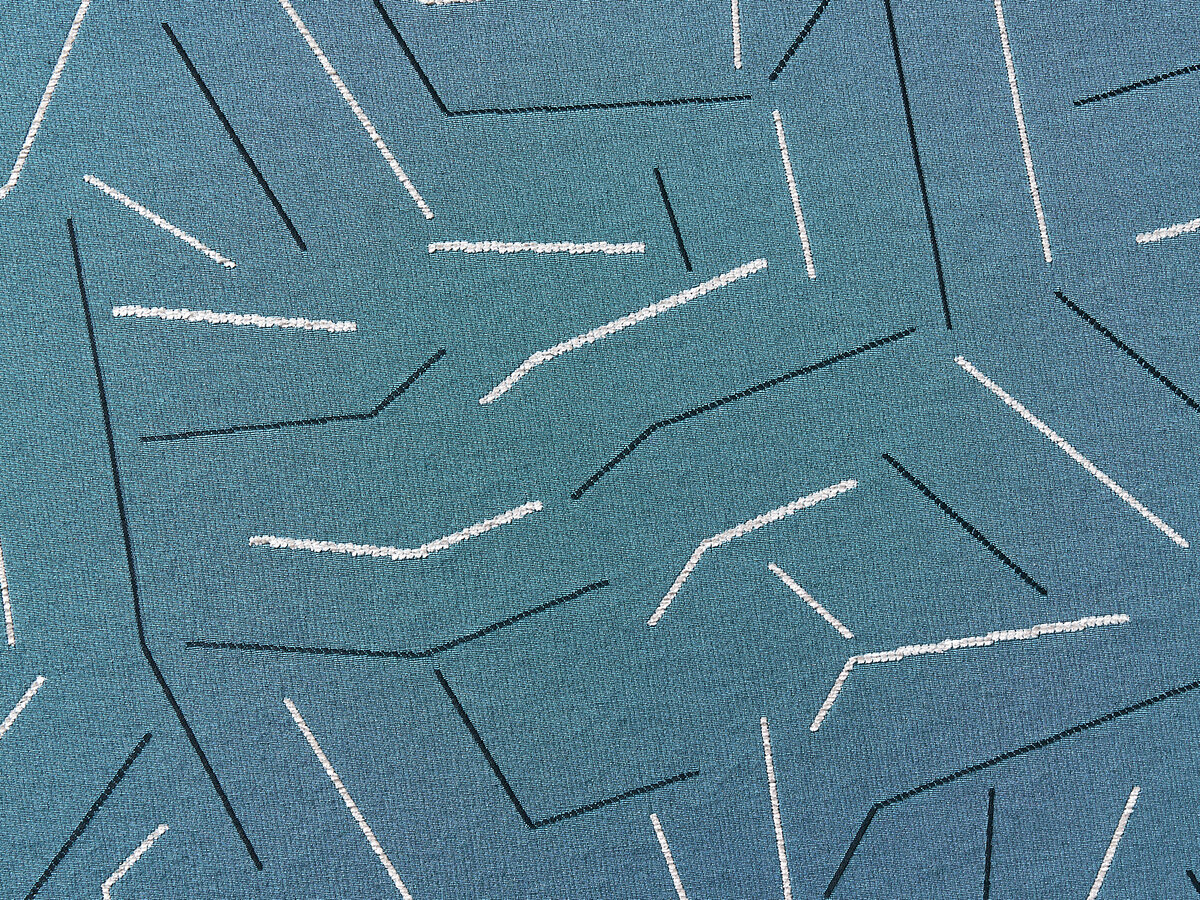 The fine broken lines of the geometric jacquard design set rhythmic color accents on the smooth, monochrome fabric surface.