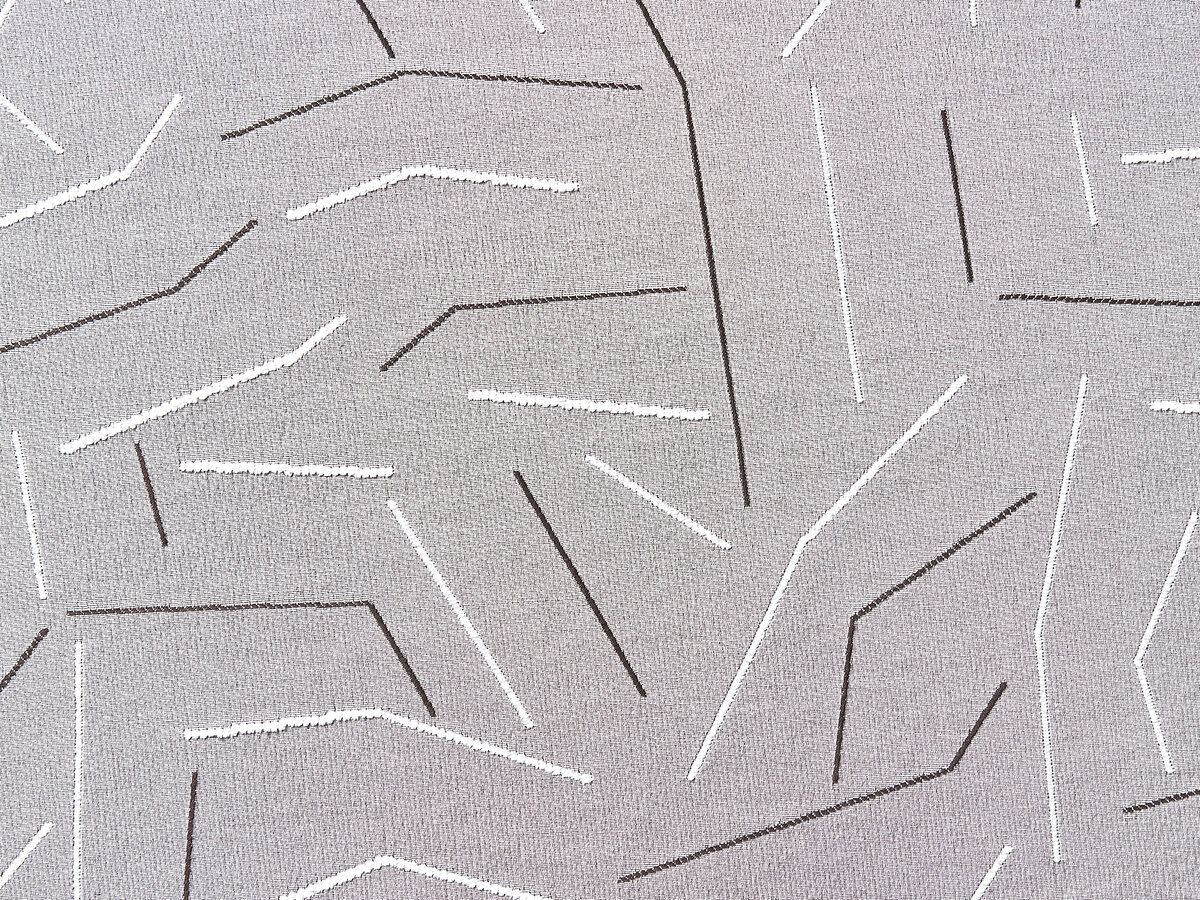 The fine broken lines of the geometric jacquard design set rhythmic color accents on the smooth, monochrome fabric surface.