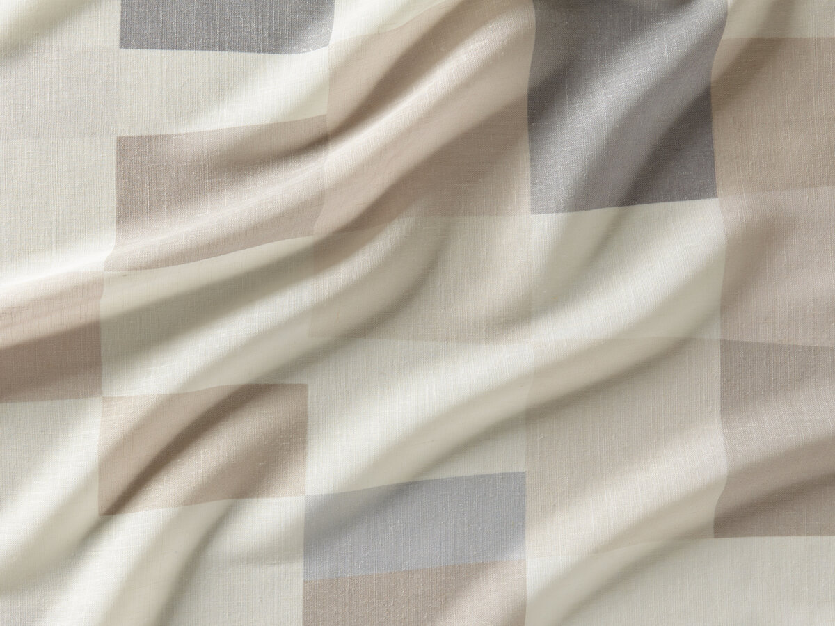 A light decorative fabric with a highly geometric and expressive pattern. Despite its strong shapes, its colours are subdued, and are reminiscent of a summer breeze, the beach and the colours of parasols. This decoration can also be railroaded.