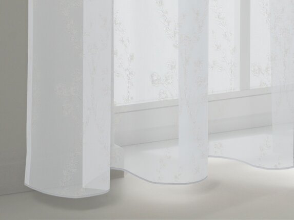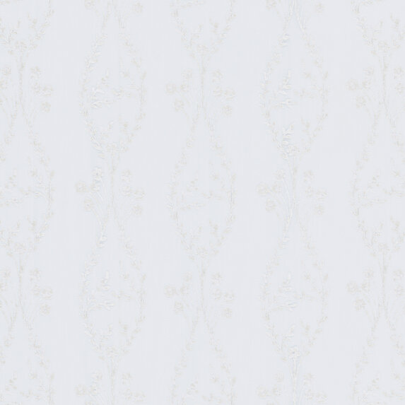 This romantic devoré pattern is true to its name. Floral vines spread delicately across the white background in four powder pastel shades, refined with fine metallic sprinkles. A lyrical air that will transform even small, cot-tage-style windows into a decorative poem.
