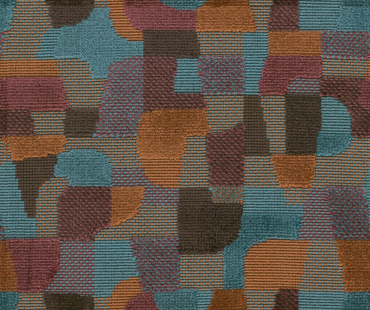 This expressive textile mosaic was woven on traditional pile-wire weaving looms with a variety of pile heights and weaving textures. The dynamic all-over design is created