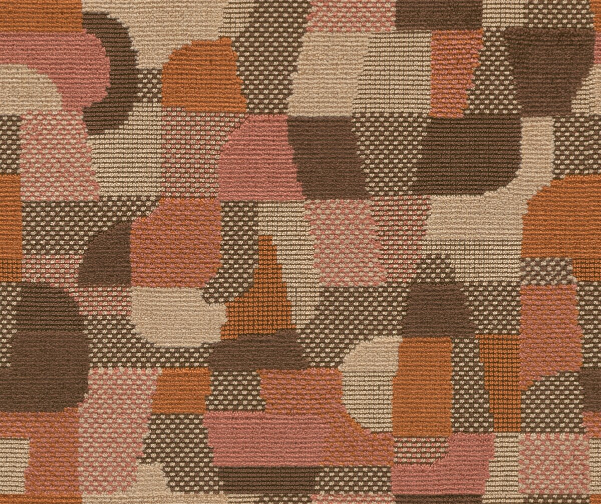 This expressive textile mosaic was woven on traditional pile-wire weaving looms with a variety of pile heights and weaving textures. The dynamic all-over design is created