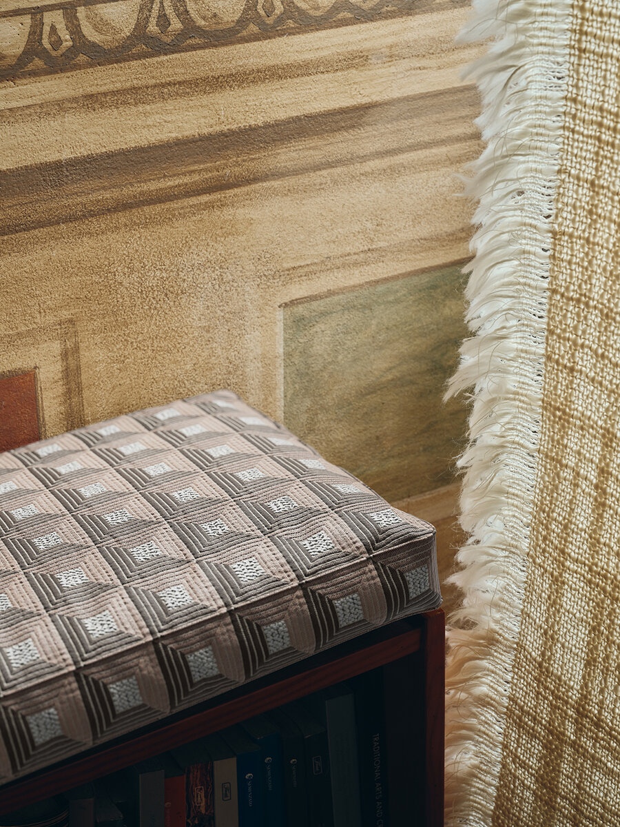 The stringency of the design and its soft feel bring classical modernity into the room, not only as an upholstery fabric, but also to accessorize, for floor cushions, bed throws and headboards.