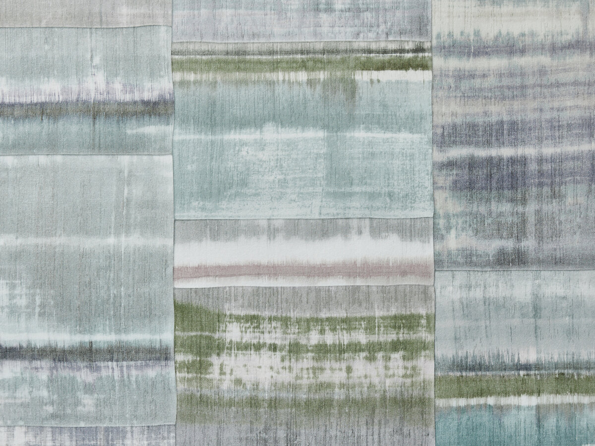 RAINBOW is the successful interpretation of a masterful watercolour, reimagined using the conventional rotogravure technique that makes it possible to apply thin lines and ultra-fine colour gradients. Finely matched hues are interwoven artfully and create a poetic, modern surface effect. Like a patchwork, the background is made up of geometric shapes and produces vertical lines, the direction of which is further underscored by a fine structure reminiscent of natural silk.