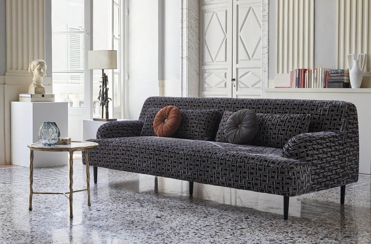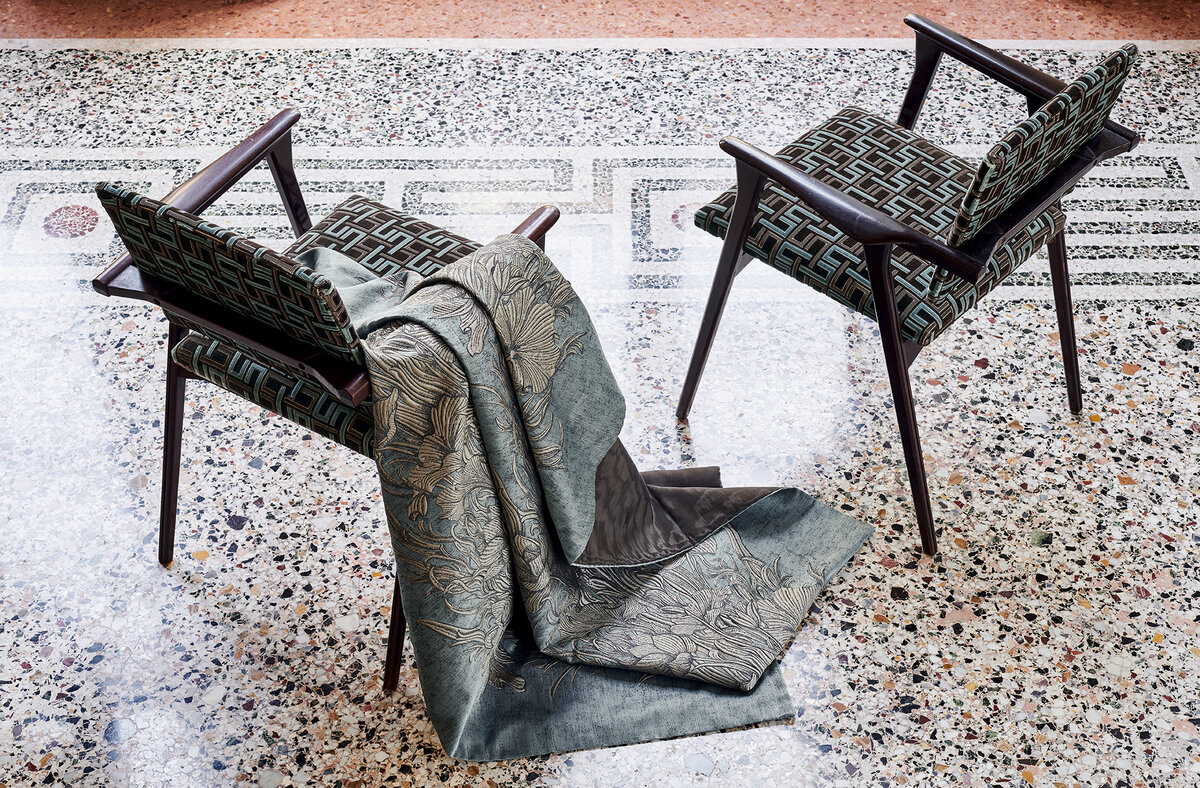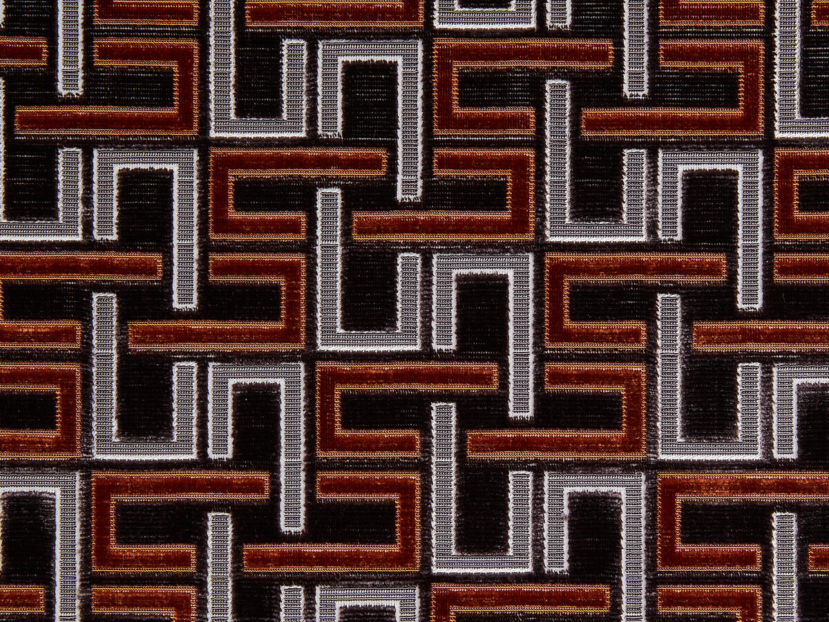 RAZIONALISMO is a lavishly produced upholstery fabric in jacquard-patterned velour, made particularly eye-catching thanks to its stylish color combination and the rhythmic character of the all-over effect of the design.