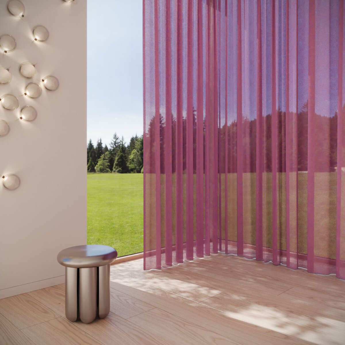 REFLEKT stands out with its iridescent color effects. Its interplay of warp and weft creates dynamic sophistication. The flame-retardant, sustainably produced sheer offers excellent glare and privacy control while maintaining high visibility—perfect for homes, offices and public spaces. A balanced fusion of design, function and color.