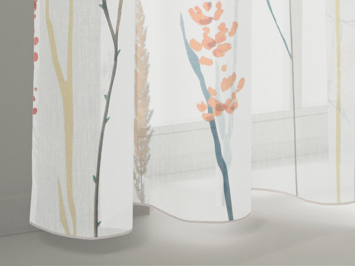 With artistic flower umbels and grasses, the RELUS base design presents itself in your home in a completely nature-inspired way. An additional eye-catcher: the striking colour gradient on the upper edge of the fabric, which slowly fades towards the bottom. The lattice structure of the gauze-like fabric made of 63 % recycled polyester is charming too, granting a lot of light and setting the right tone.