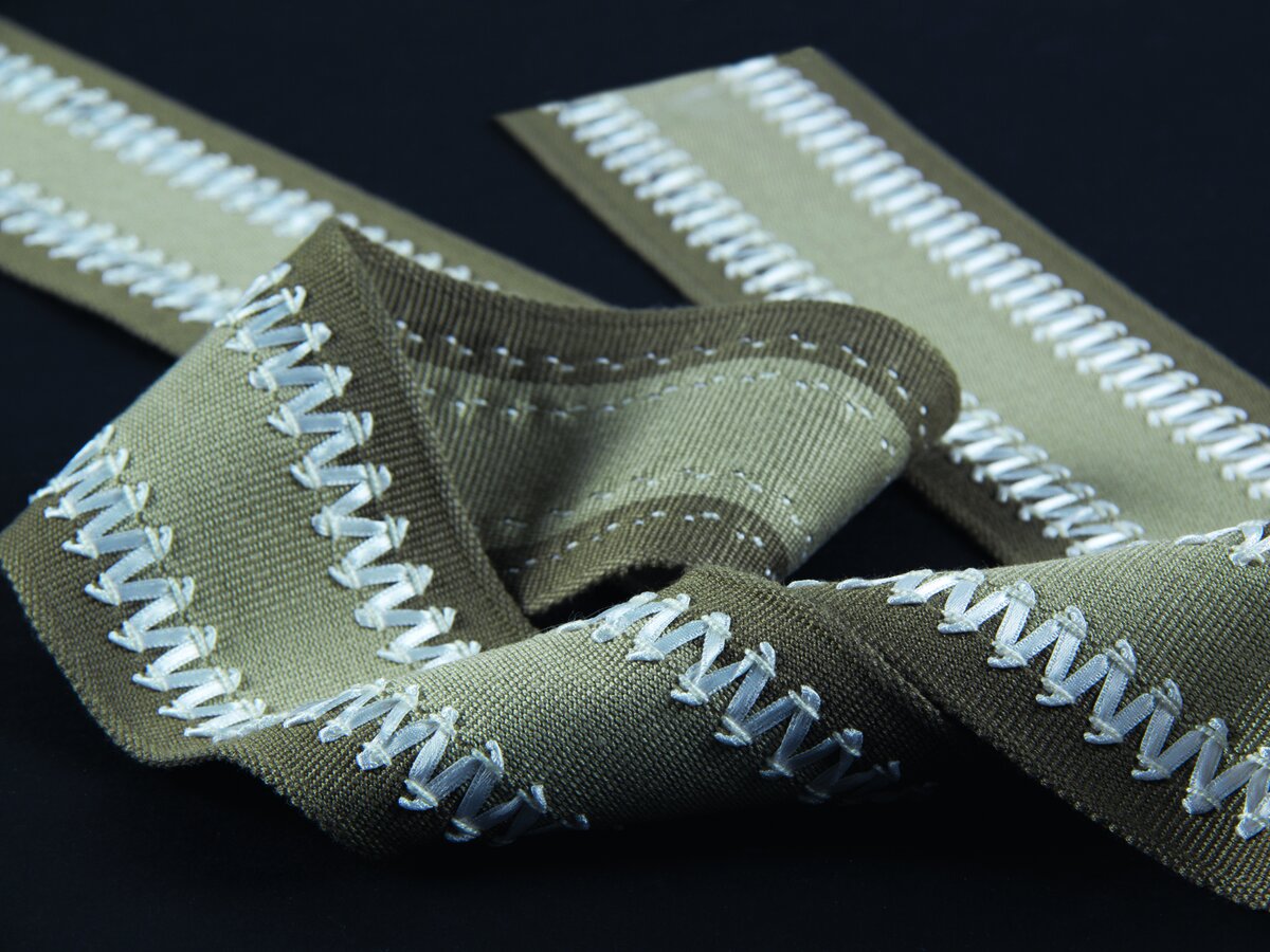 This interlaced stitching is reminiscent of fashionable corsets. It evokes modernity for various applications. The result of the interlacing on a grosgrain ground allows for use in all types of interiors.