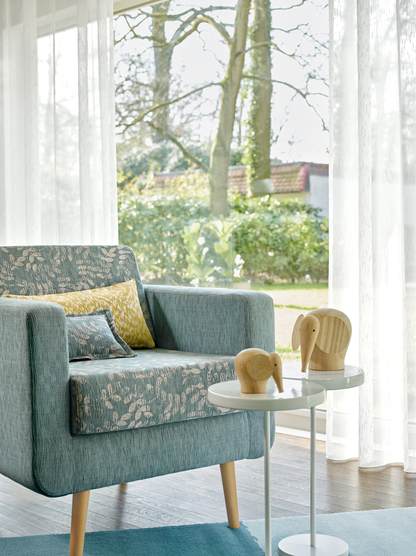 Decorative rustling leaf patterns awaken the summer! Using the SABADO fabric as a base, these leaves create a versatile allover design. Combine it with the textured single-coloured SABADO fabric for the perfect upholstery duo! Whether it is used for a sofa, an armchair or a chair, the ROBINO upholstery fabric will always sit pretty!