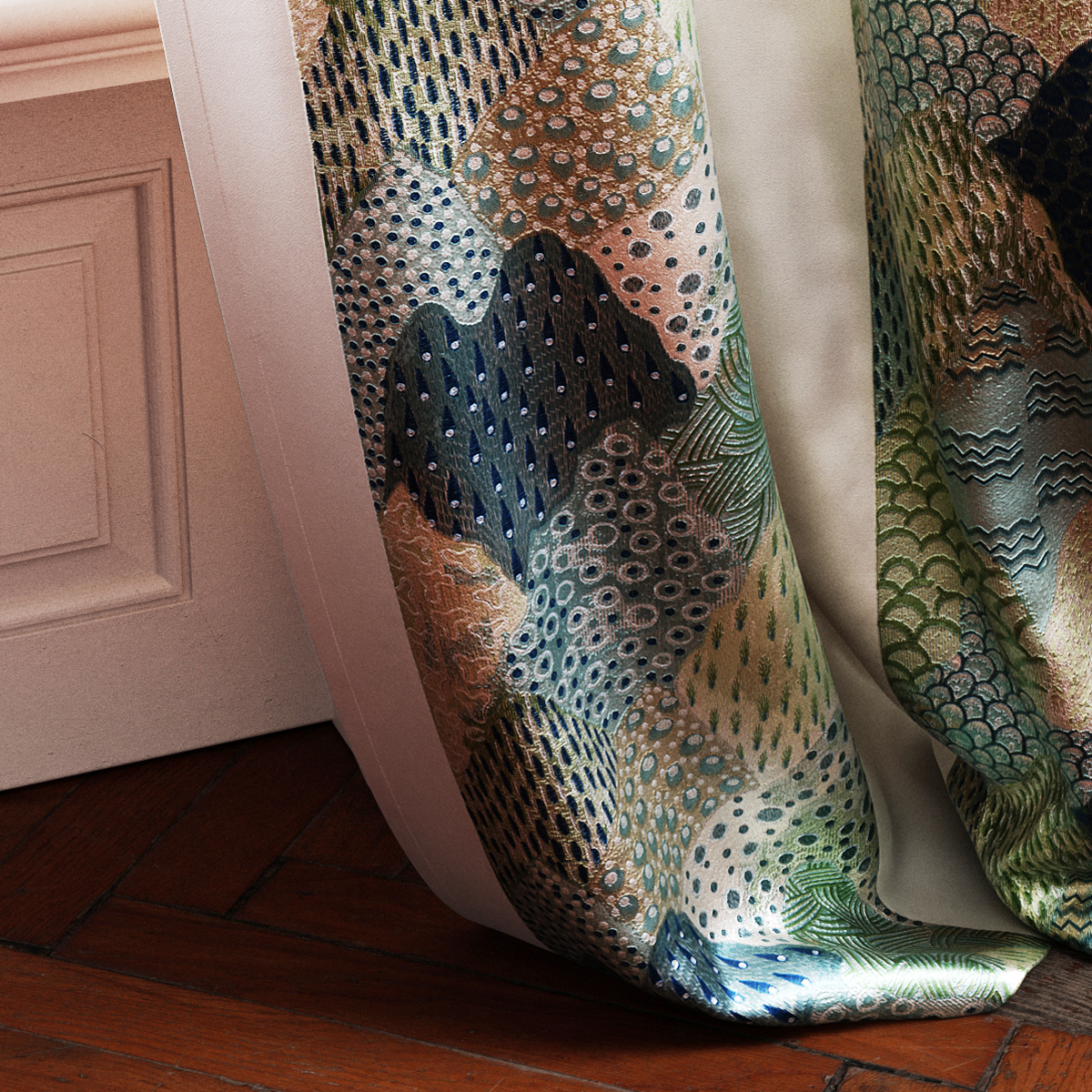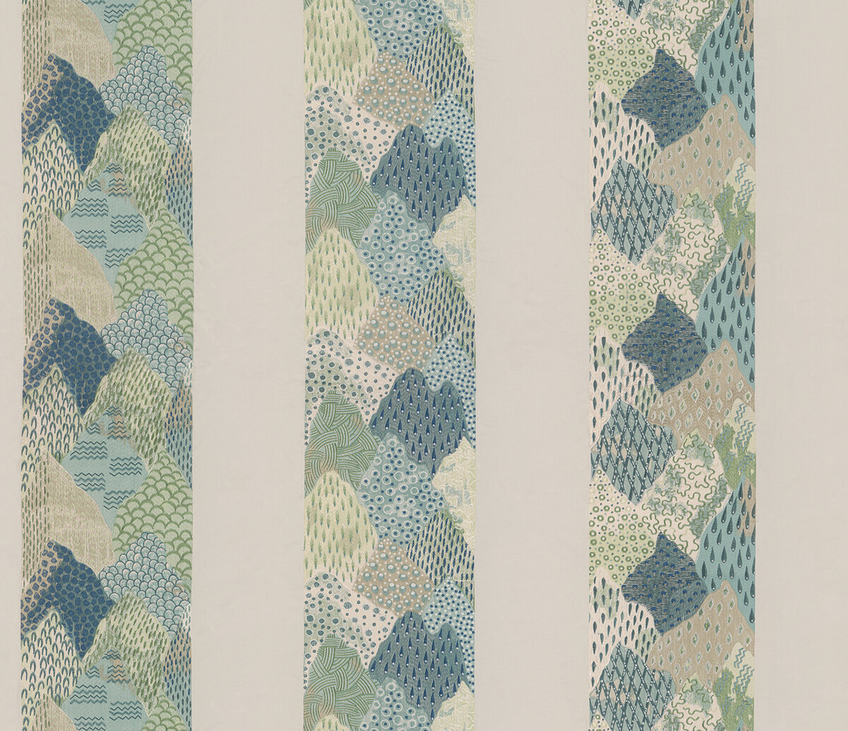A modern take on classic depictions of Asian landscapes as an impressive block stripe design. Opulent and abstract at the same time. The imaginatively designed motifs within the blocks were embroidered with the finest viscose yarns, in an unusually high thread density on the elegant cotton sateen. ROLLING HILLS is available in three colorways.