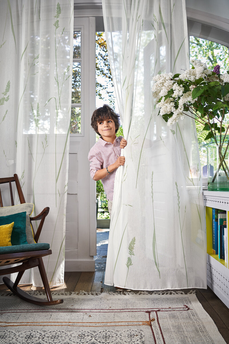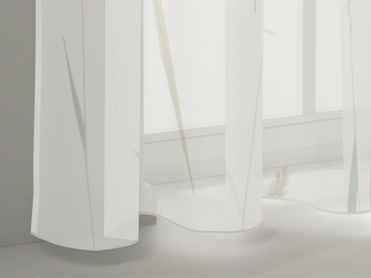 SAMANTHA’s modern and contemporary design conveys a stylish Scandinavian vibe. Individual, oversized blades of grass appear to sway, making the viewer feel as if they can hear the rustling of the wind. Delicate, matt structured thread gives the base fabric a natural texture and a pleasantly soft flowing touch.