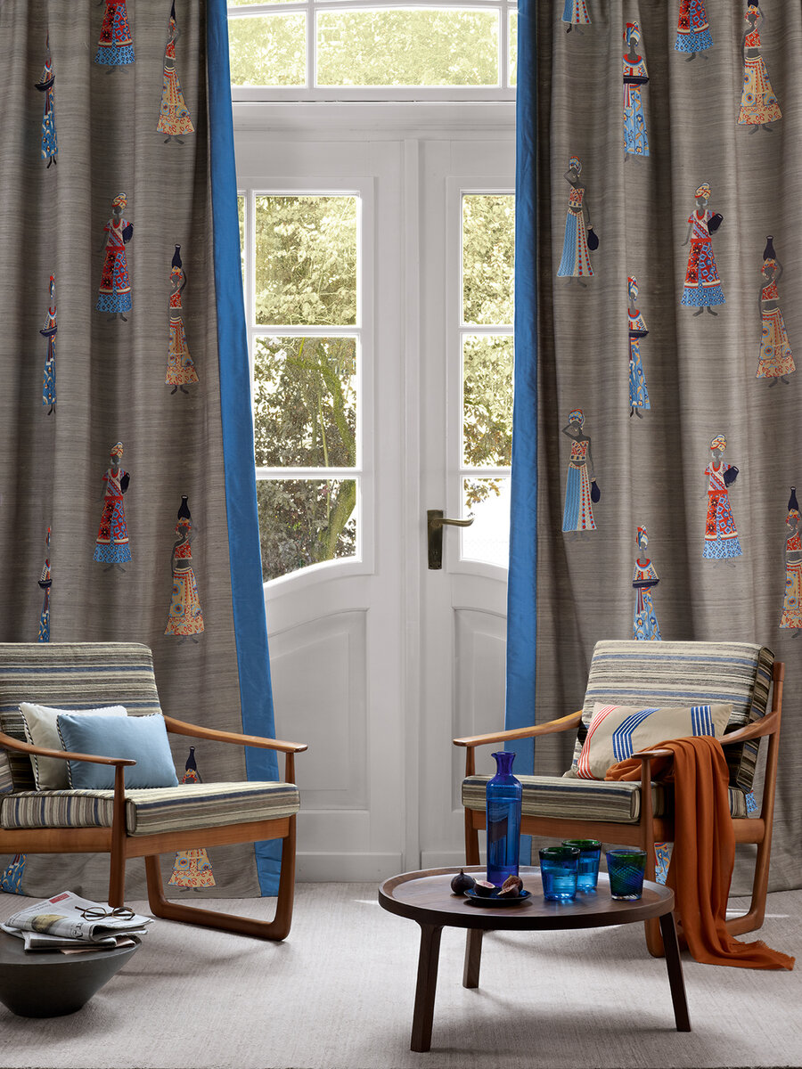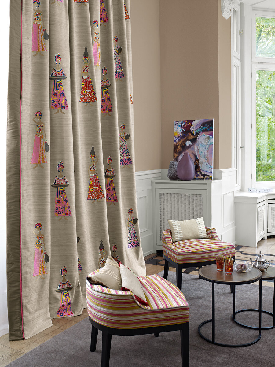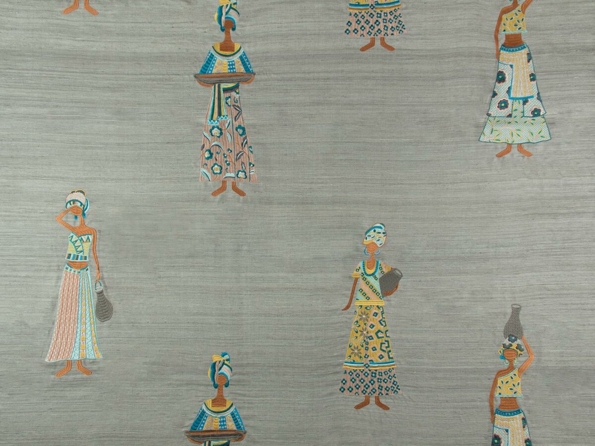 Intricate embroidery on hand-woven tussar silk. The motif consists of proud women in lavishly decorated garments. The single-coloured background presents an intriguing contrast to the highly coloured, detailed embroidery.