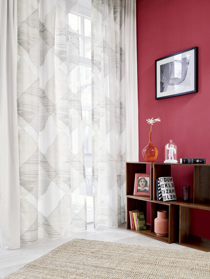 SCALE boasts truly beautiful geometry. This burn out fabric looks like square autumnal meadows from a distance, lined up one after the other. Featuring a modern graphic print, SCALE comes in elegant white-on-white, modern silver and cosy kid with taupe. A Perlex print flatters the sophisticated interplay of matte and gleaming textures.