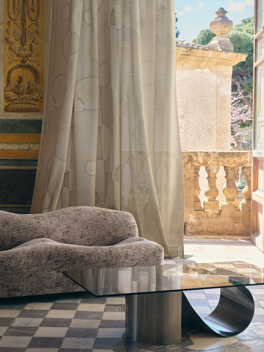 Inspired by the eponymous ancient Sicilian city and its world-renowned temple, this full-length transparent fabric reflects a delightful interplay of modernity and classicism.