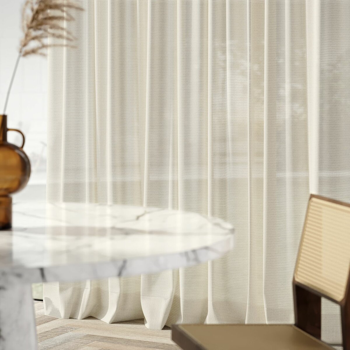 Semifreddo, with its soft pastel colors and unique net structure, adds a relaxed vibe to any room. A blend of 97% polyester and 3% linen, this fabric offers delightful transparency and a casual, light drape.